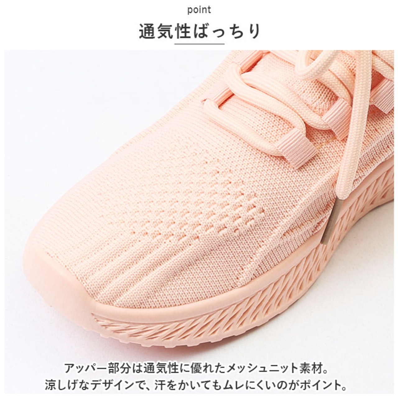 ・アッパー部分は通気性に優れたメッシュニット素材。涼しげなデザインで、汗をかいてもムレにくいのがポイント。