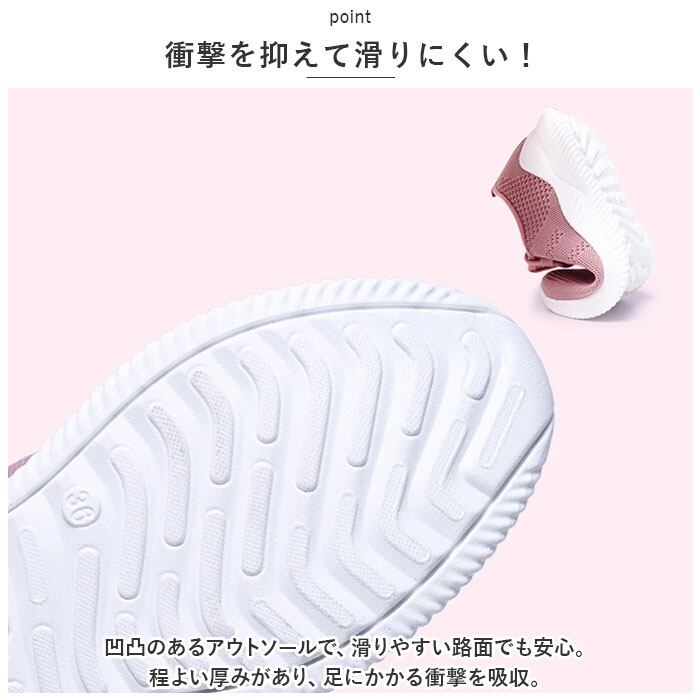 ・凹凸のあるアウトソールで、滑りやすい路面でも安心。程よい厚みがあり、足にかかる衝撃を吸収。