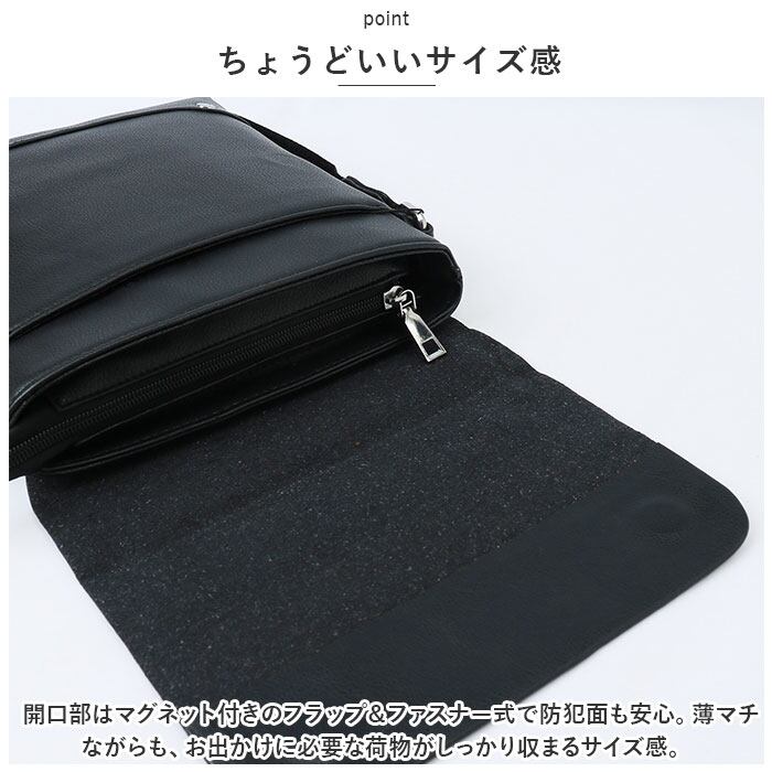 ・開口部はマグネット付きのフラップ&ファスナー式で防犯面も安心。薄マチながらも、お出かけに必要な荷物がしっかり収まるサイズ感。