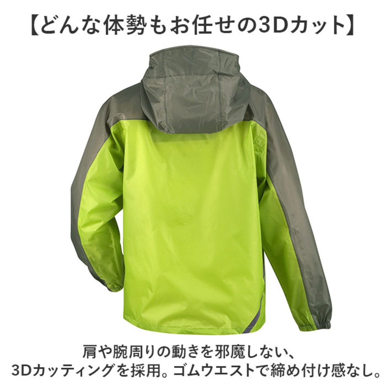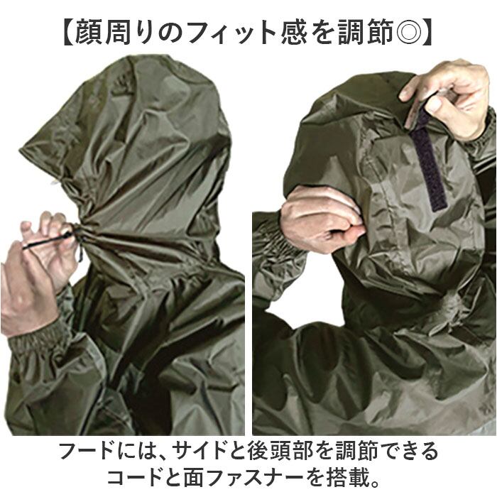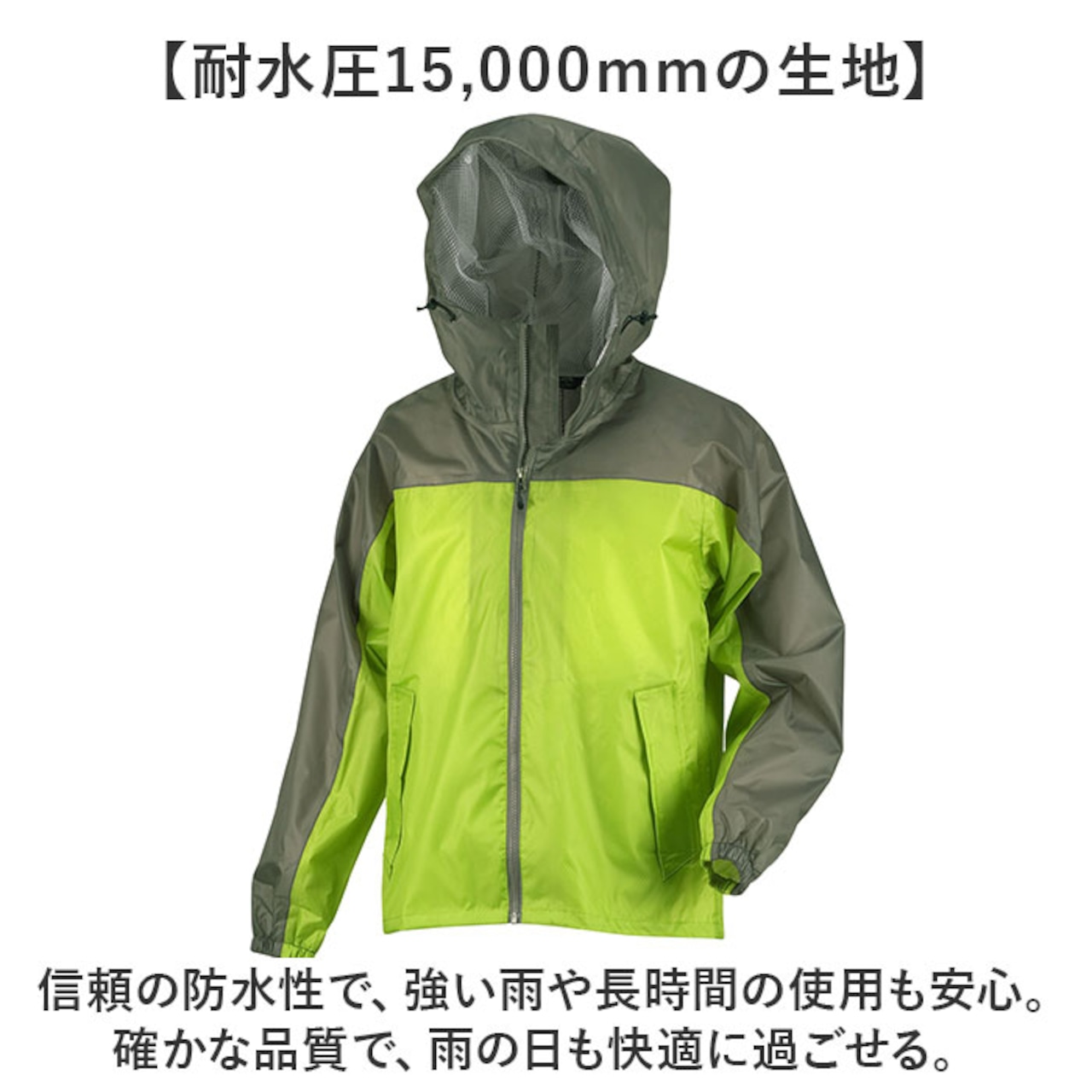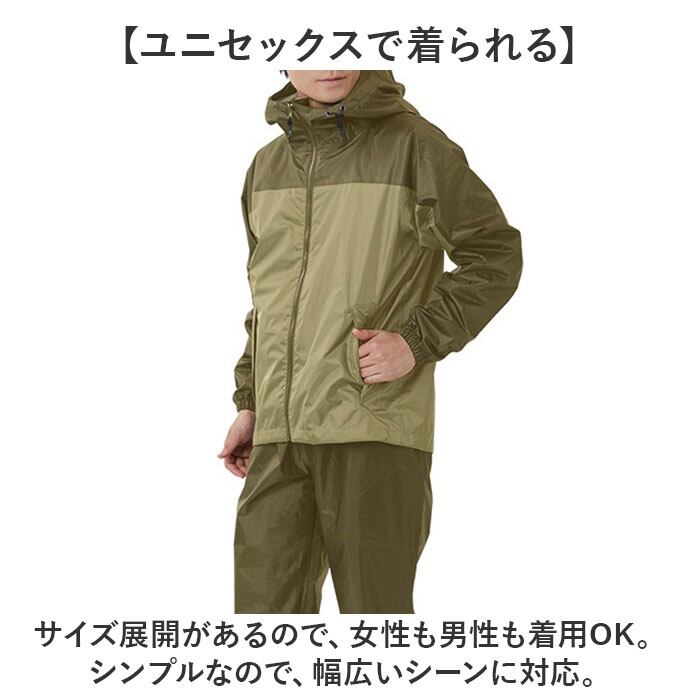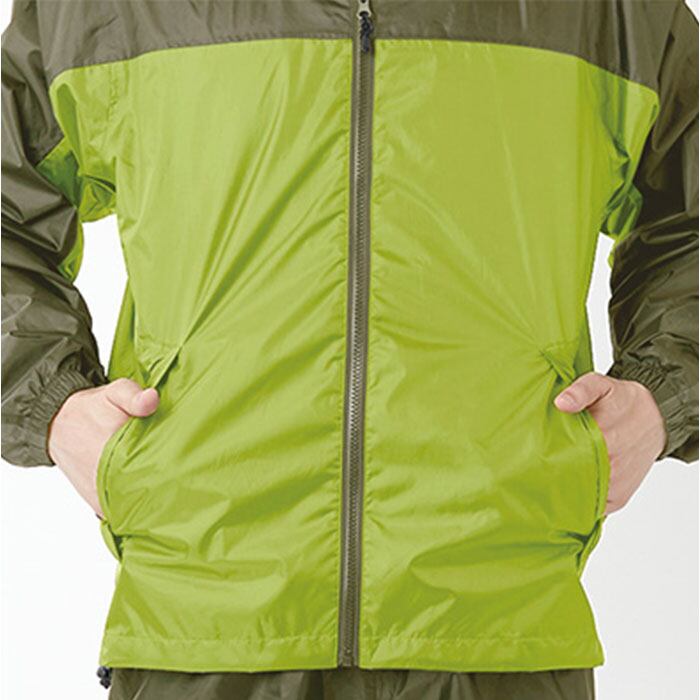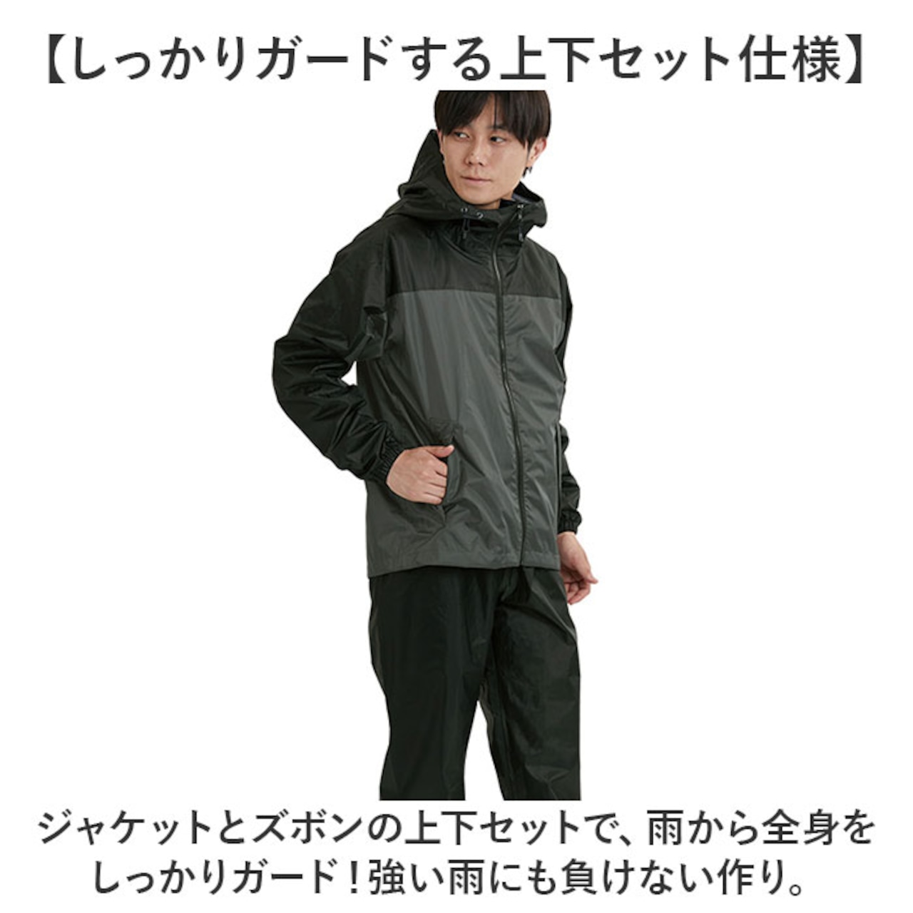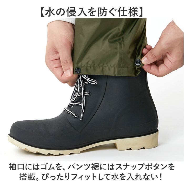 ・ジャケットとズボンの上下セットで、雨から全身をしっかりガード!強い雨にも負けない作り。