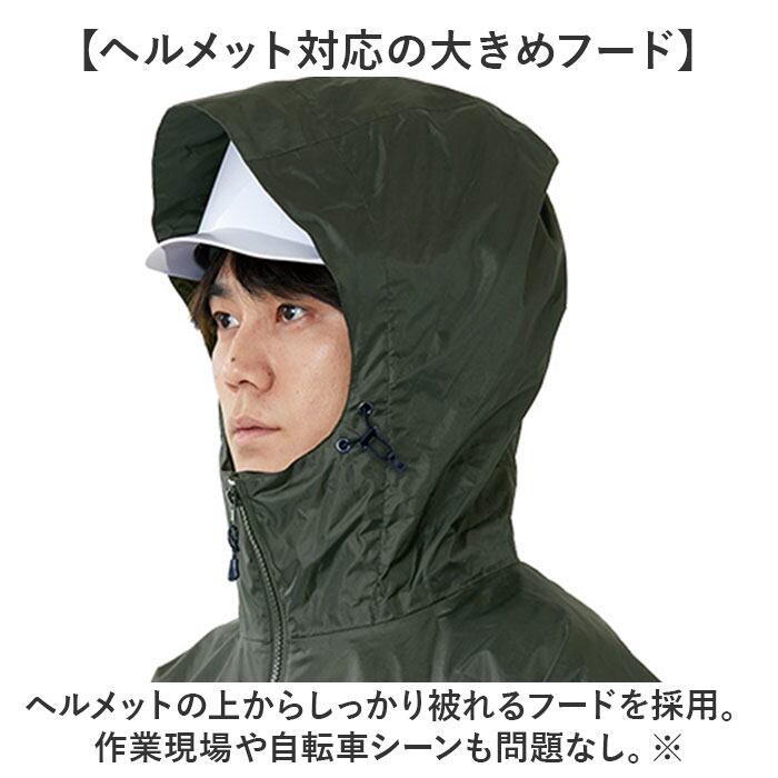 ・ヘルメットの上からしっかり被れるフードを採用。作業現場や自転車シーンも問題なし。