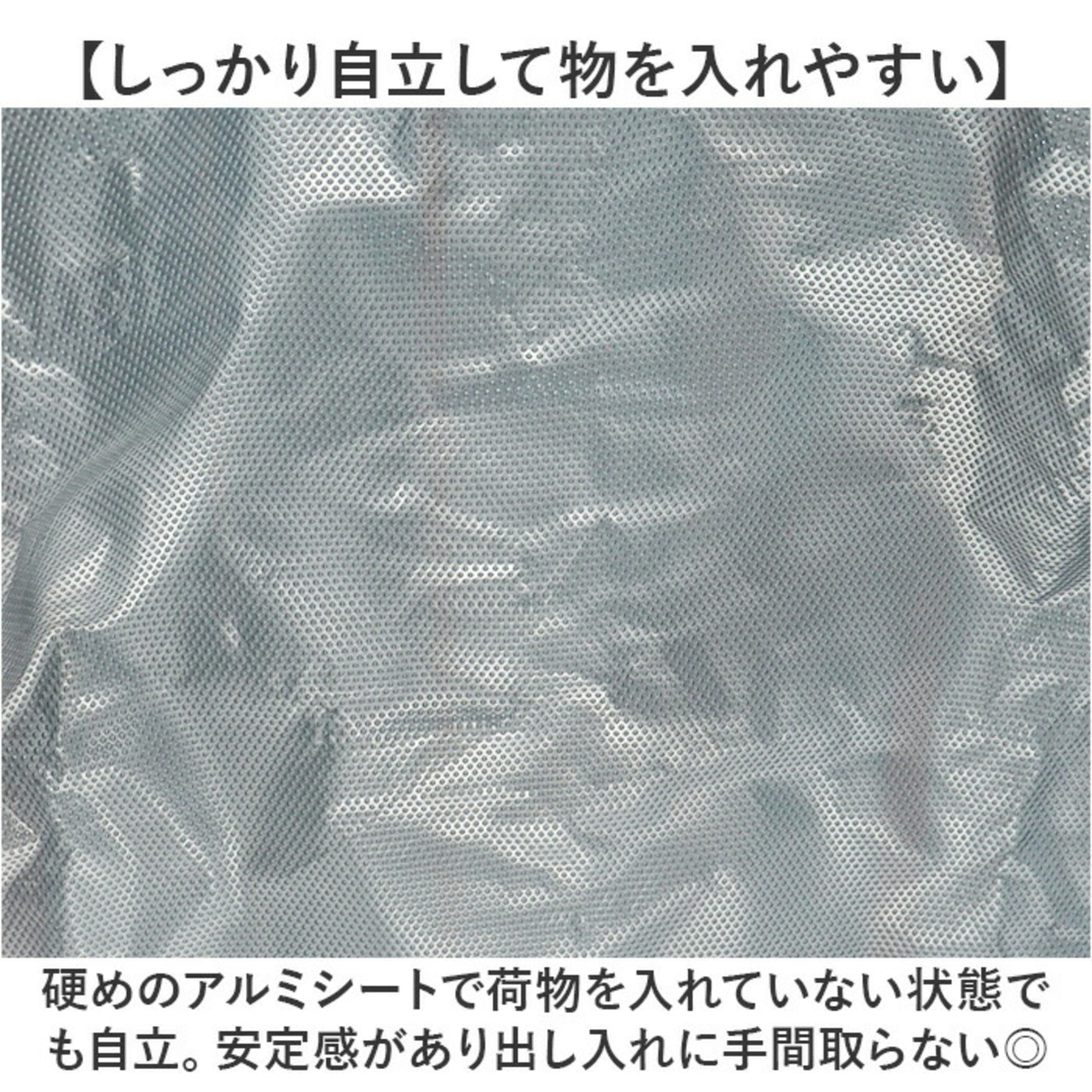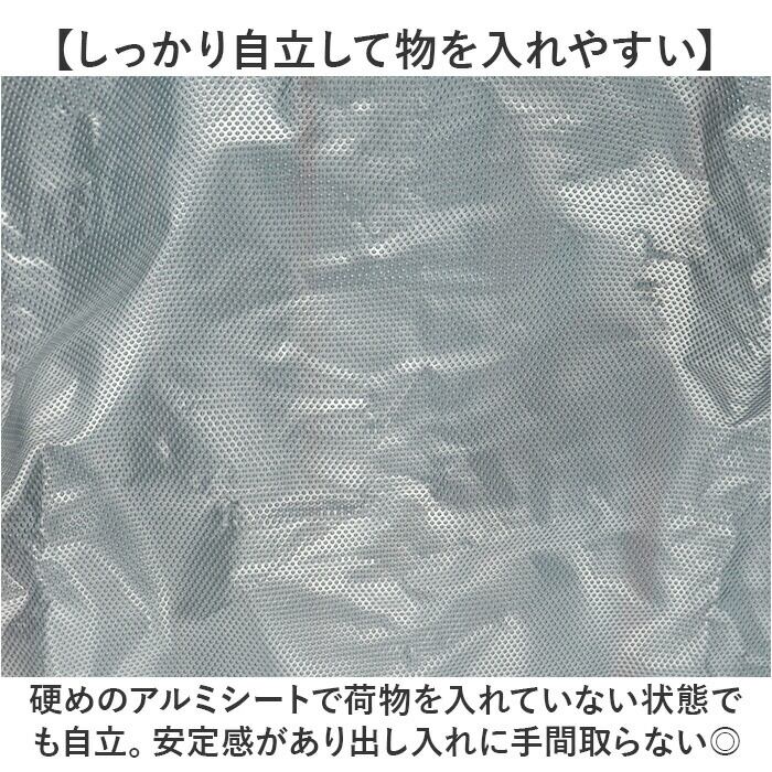 ・硬めのアルミシートで荷物を入れていない状態でも自立。安定感があり出し入れに手間取らない◎