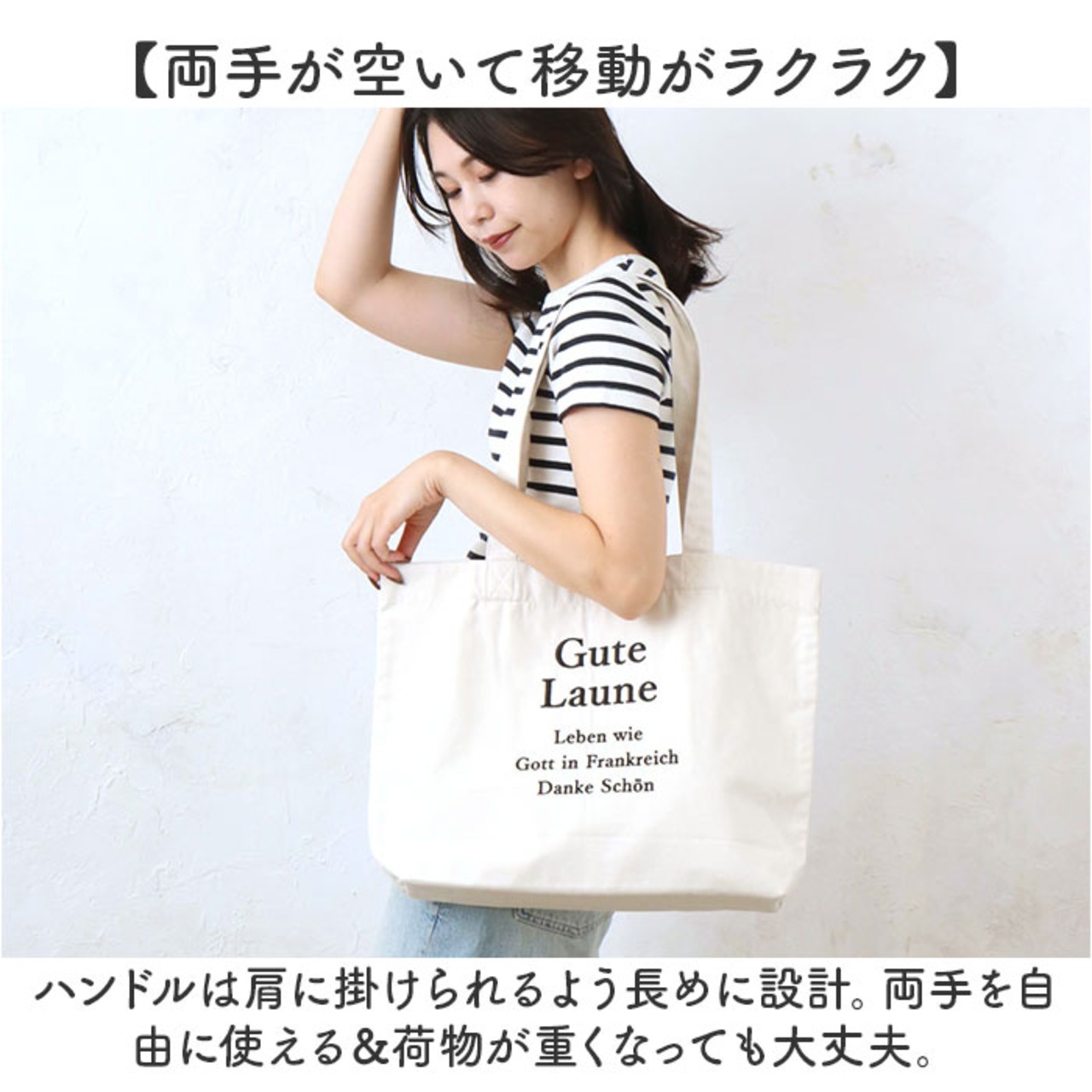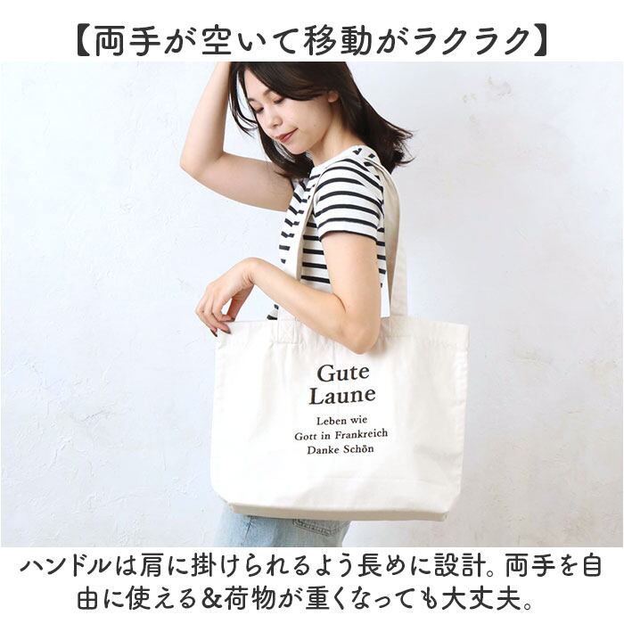 ・ハンドルは肩に掛けられるよう長めに設計。両手を自由に使える&荷物が重くなっても大丈夫。