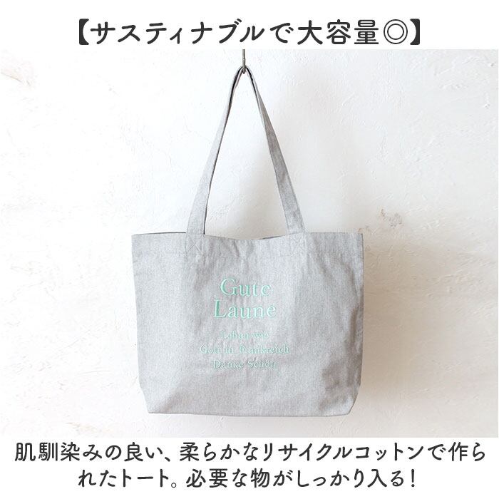 ・肌馴染みの良い、柔らかなリサイクルコットンで作られたトート。必要な物がしっかり入る!