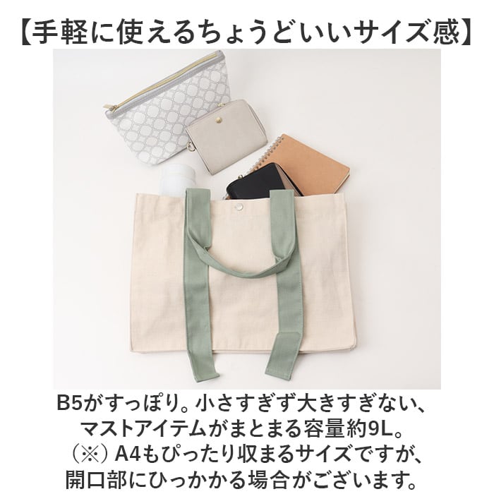 ・B5がすっぽり。小さすぎず大きすぎない、マストアイテムがまとまる容量約9L。