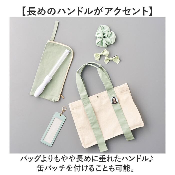 ・バッグよりもやや長めに垂れたハンドル♪缶バッチを付けることも可能。