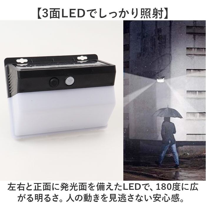 ・左右と正面に発光面を備えたLEDで、180度に広がる明るさ。人の動きを見逃さない安心感。