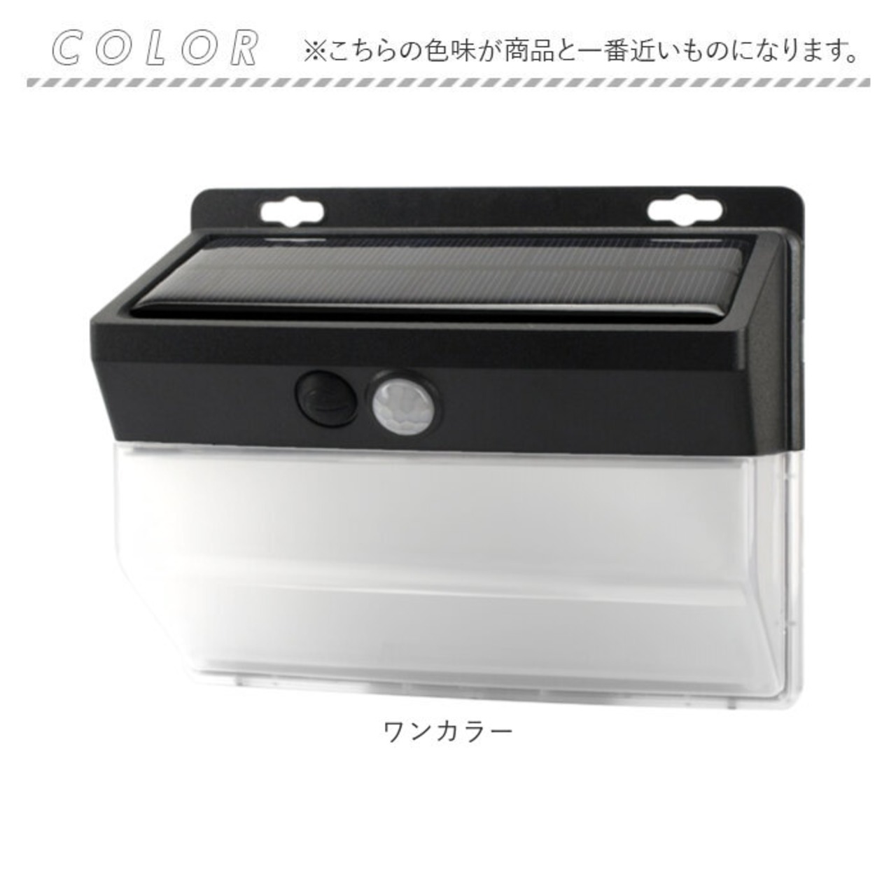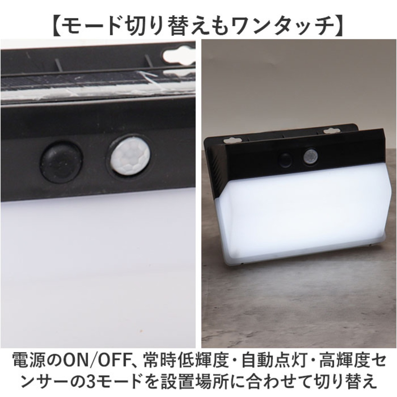 ・電源のON/OFF、常時低輝度・自動点灯・高輝度センサーの3モードを設置場所に合わせて切り替え