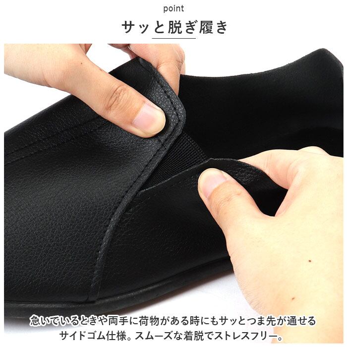 ・急いでいるときや両手に荷物がある時にもサッとつま先が通せるサイドゴム仕様。スムーズな着脱でストレスフリー。