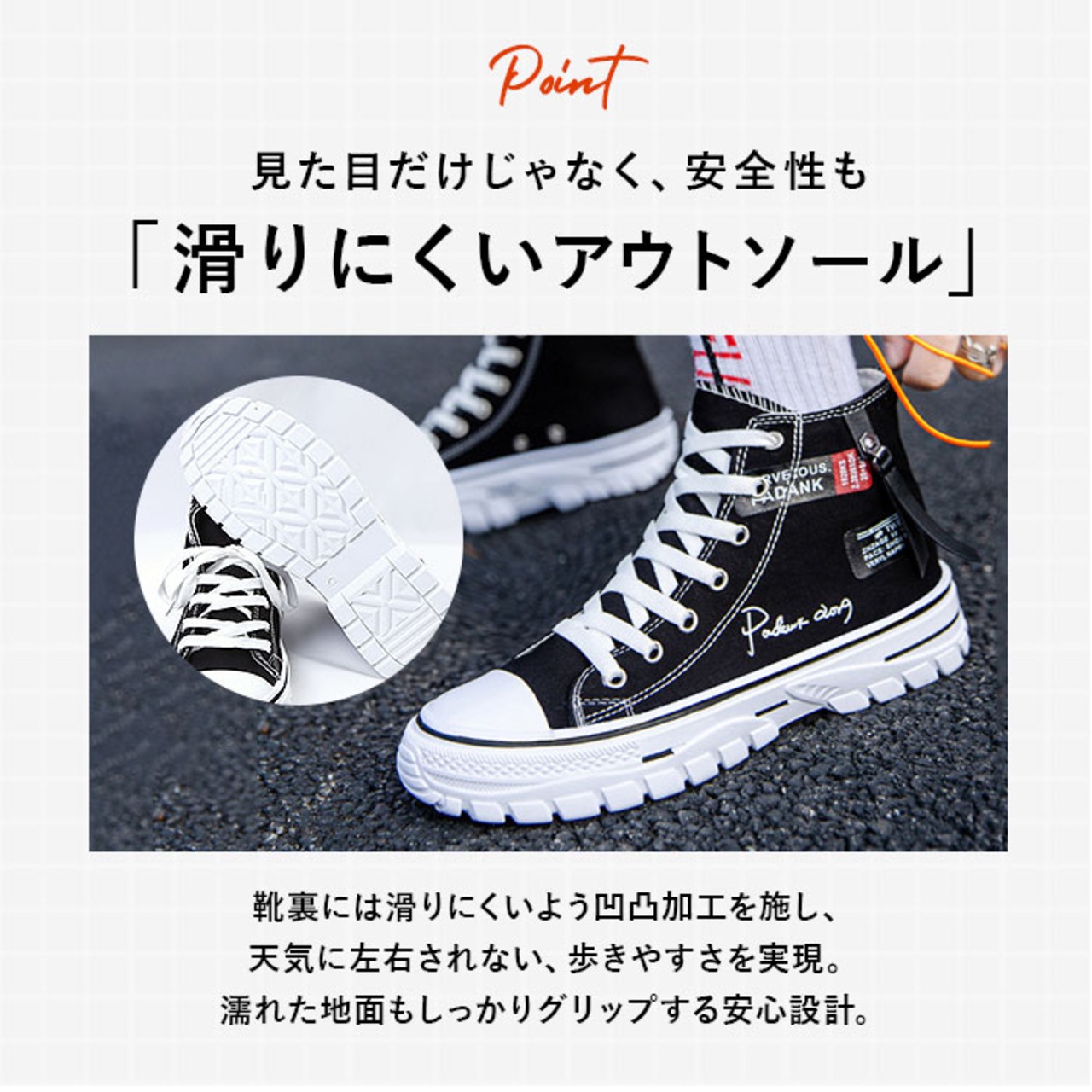 ・靴裏には滑りにくいよう加工を施し、歩きやすさに配慮。雨の日でも地面をしっかりグリップしてくれる安心の仕様。