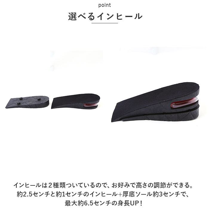 ・インヒールは2種類ついているので、お好みで高さの調節ができる。約2.5センチと約1センチのインヒール+厚底ソール約3センチで、最大約6.5センチの身長UP!