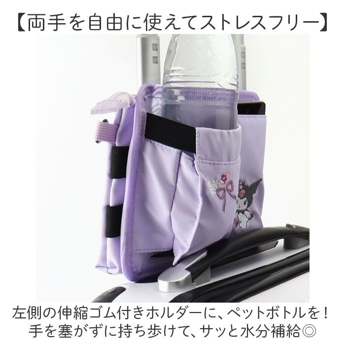 ・左側の伸縮ゴム付きホルダーに、ペットボトルを!手を塞がずに持ち歩けて、サッと水分補給◎