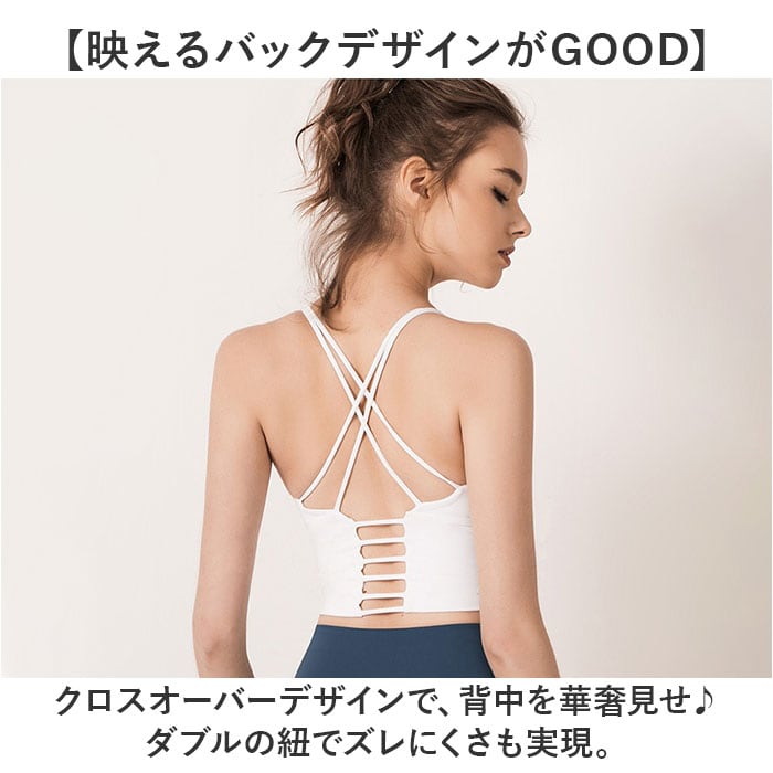 ・クロスオーバーデザインで、背中を華奢見せ♪ダブルの紐でズレにくさも実現。