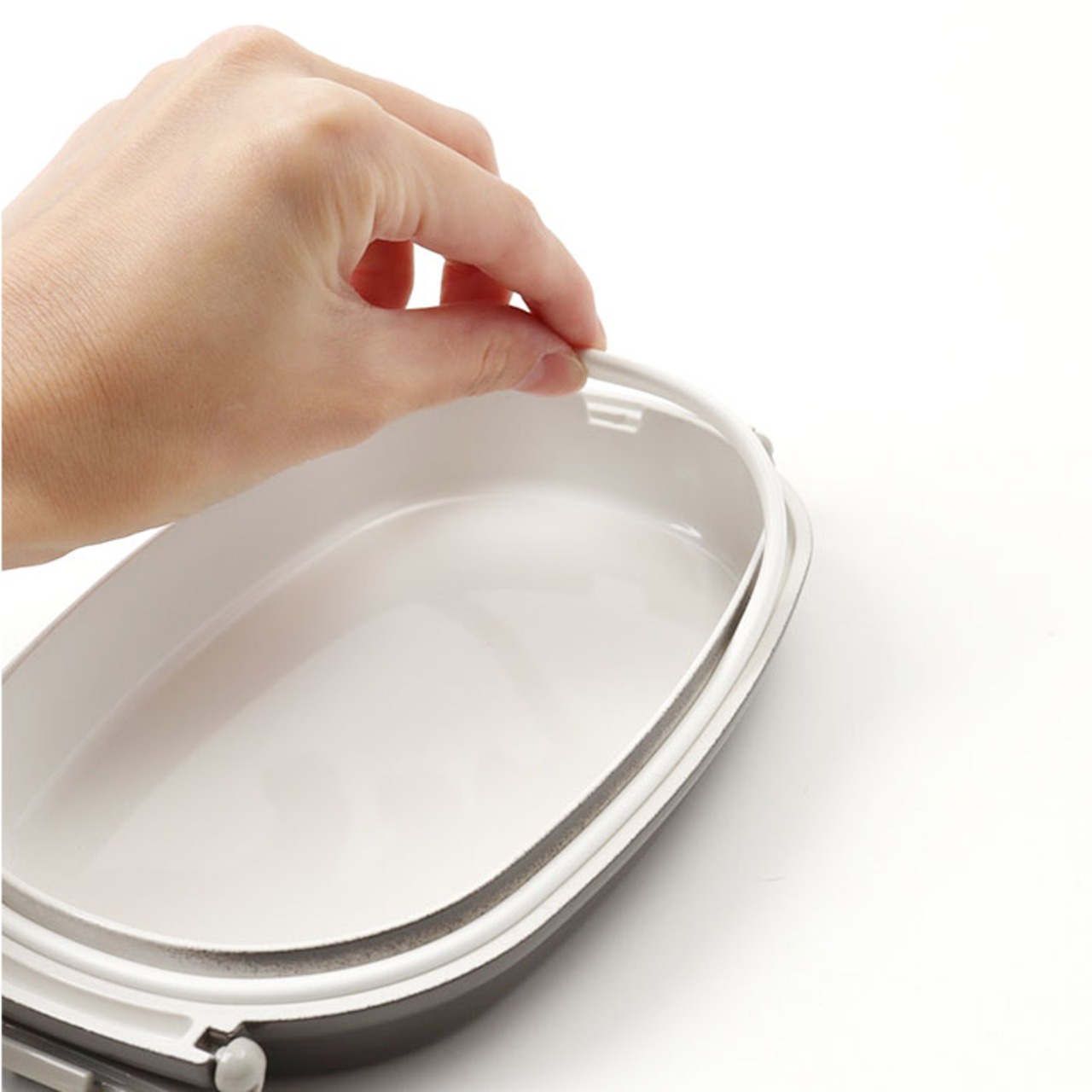 ・フタの両サイドをカチッと留めるだけ。開閉しやすく、パッキン付きで汁漏れしにくい◎