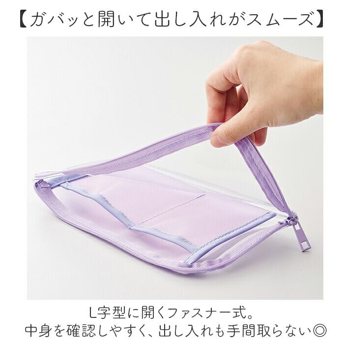 ・L字型に開くファスナー式。中身を確認しやすく、出し入れも手間取らない◎