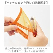 ・推しの缶バッチは、内側のメッシュポケットにピンを通すだけ。見せたい向きに固定。