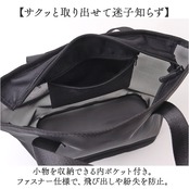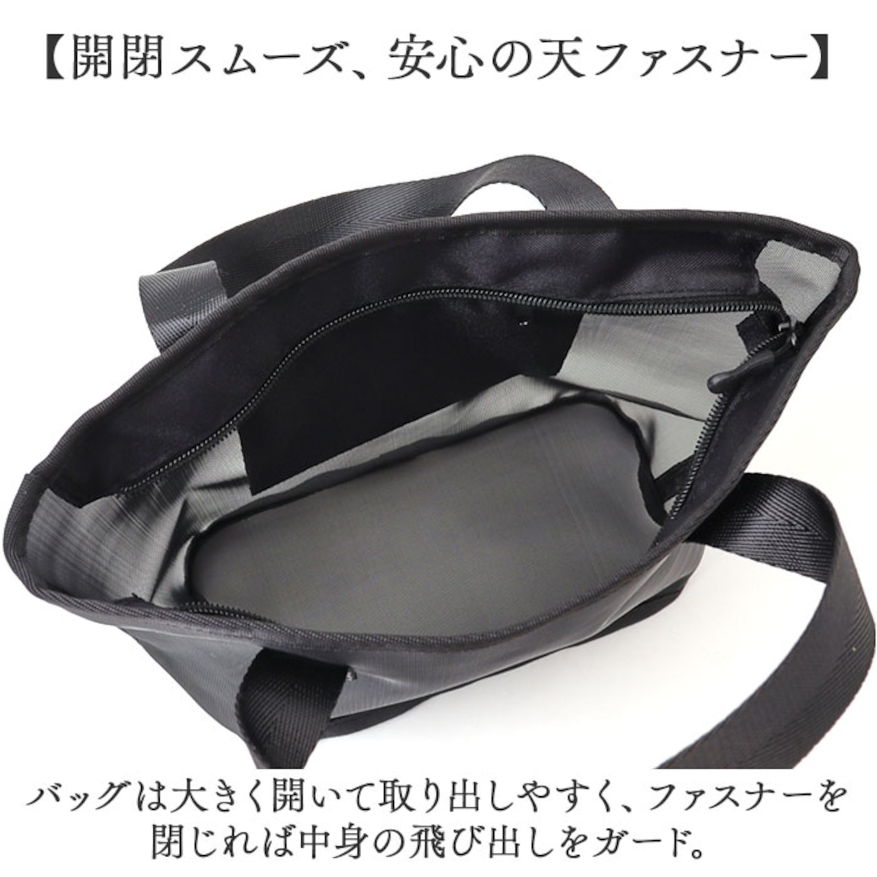 ・バッグは大きく開いて取り出しやすく、ファスナーを閉じれば中身の飛び出しをガード。