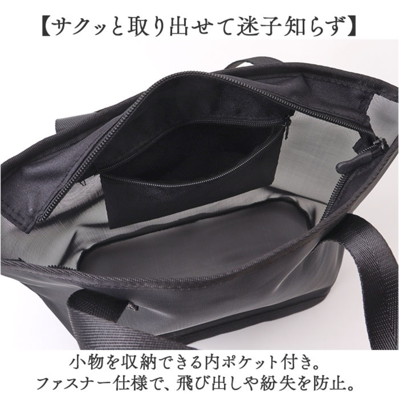 ・小物を収納できる内ポケット付き。ファスナー仕様で、飛び出しや紛失を防止。