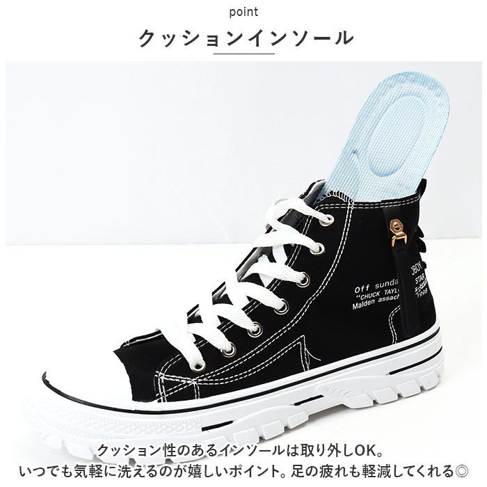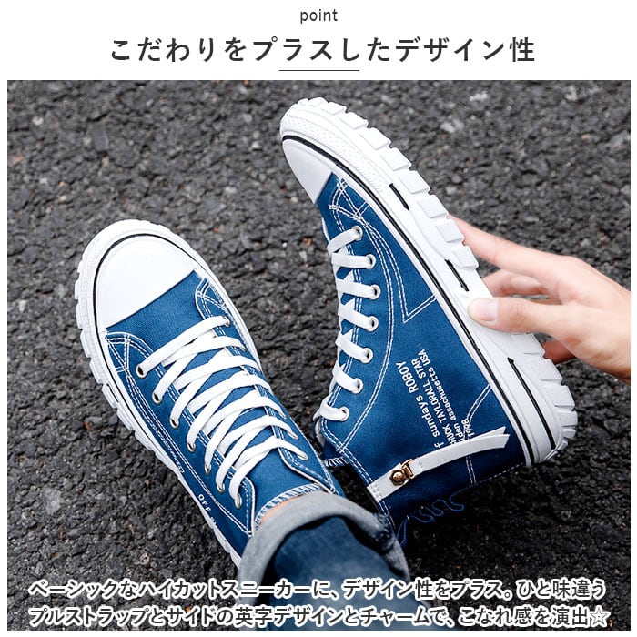 ・ベーシックなハイカットスニーカーに、デザイン性をプラス。ひと味違うプルストラップとサイドの英字デザインとチャームで、こなれ感を演出☆