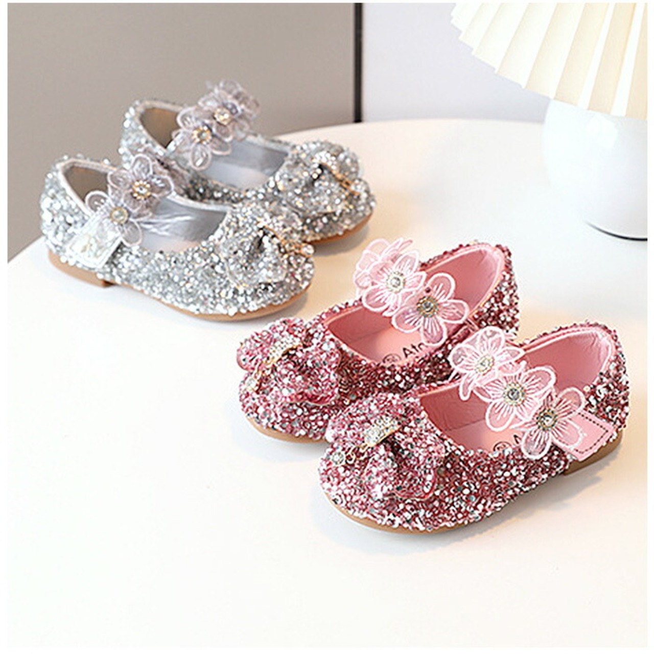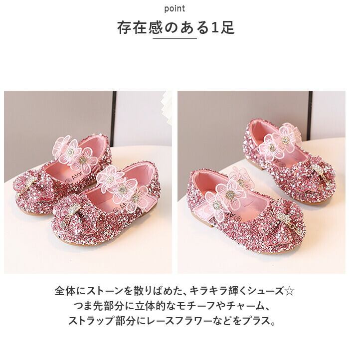 ・全体にストーンを散りばめた、キラキラ輝くシューズ☆つま先部分に立体的なモチーフやチャーム、ストラップ部分にレースフラワーなどをプラス。