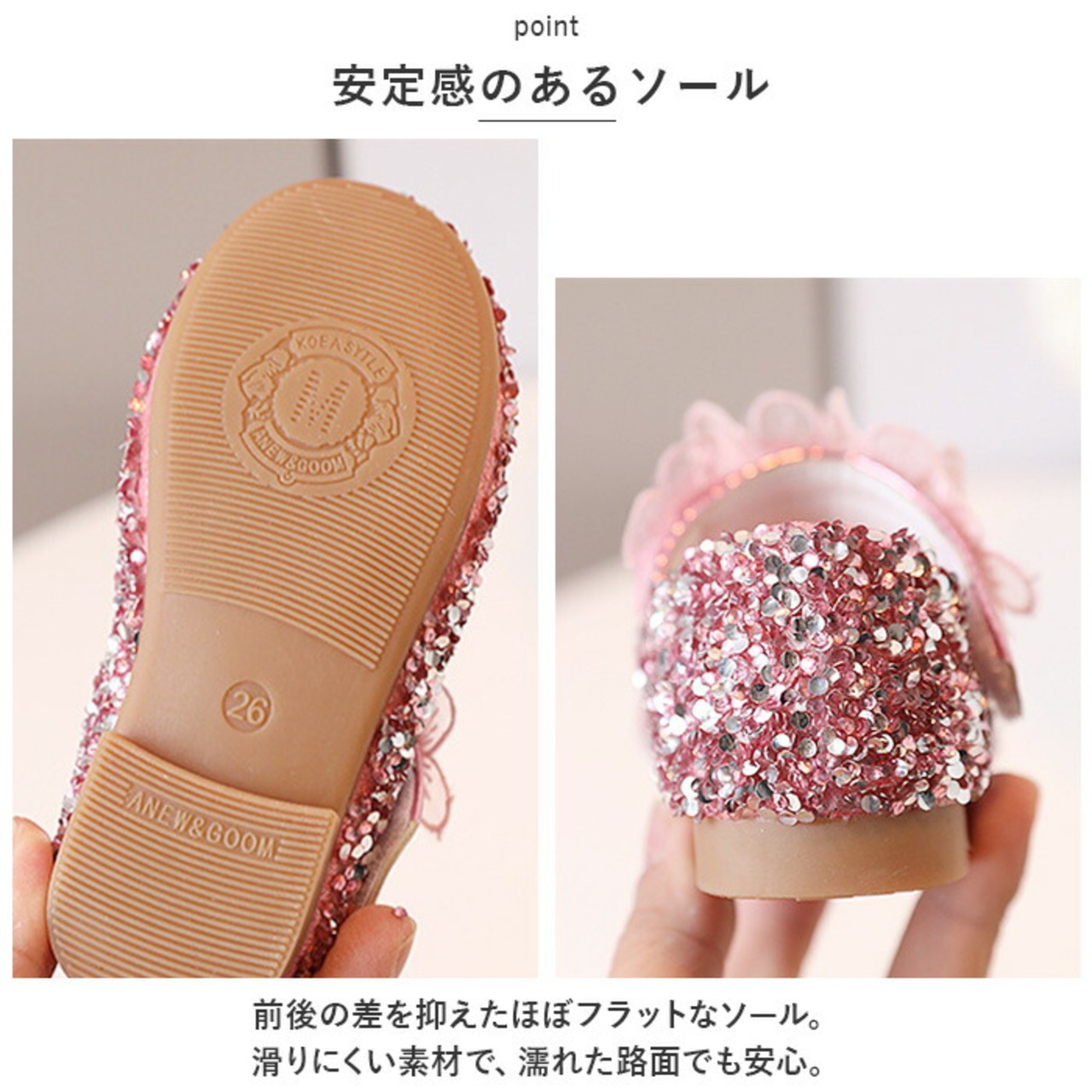 ・前後の差を抑えたほぼフラットなソール。滑りにくい素材で、濡れた路面でも安心。