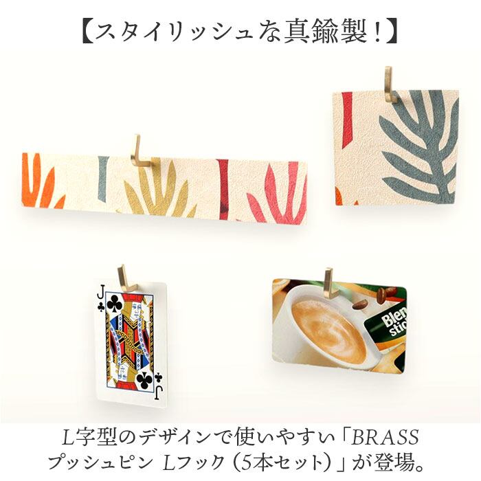 ・L字型のデザインで使いやすい「BRASS プッシュピン Lフック(5本セット)」が登場。