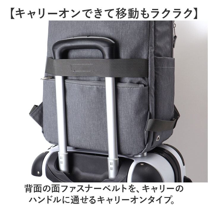 ・背面の面ファスナーベルトを、キャリーのハンドルに通せるキャリーオンタイプ。