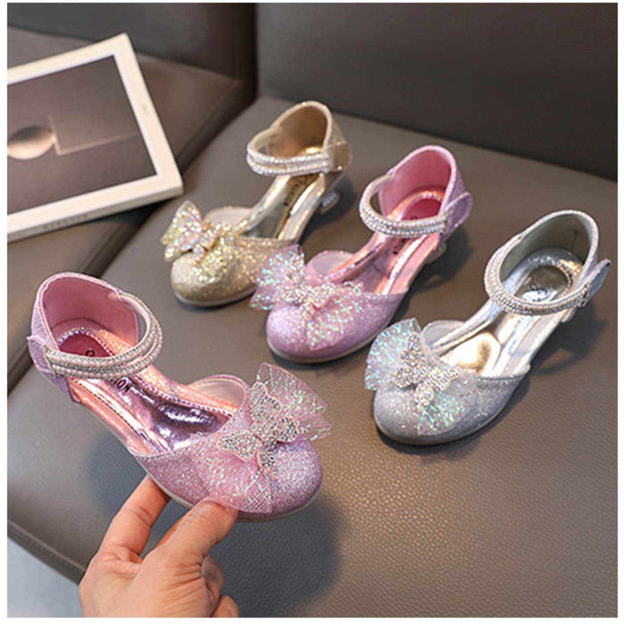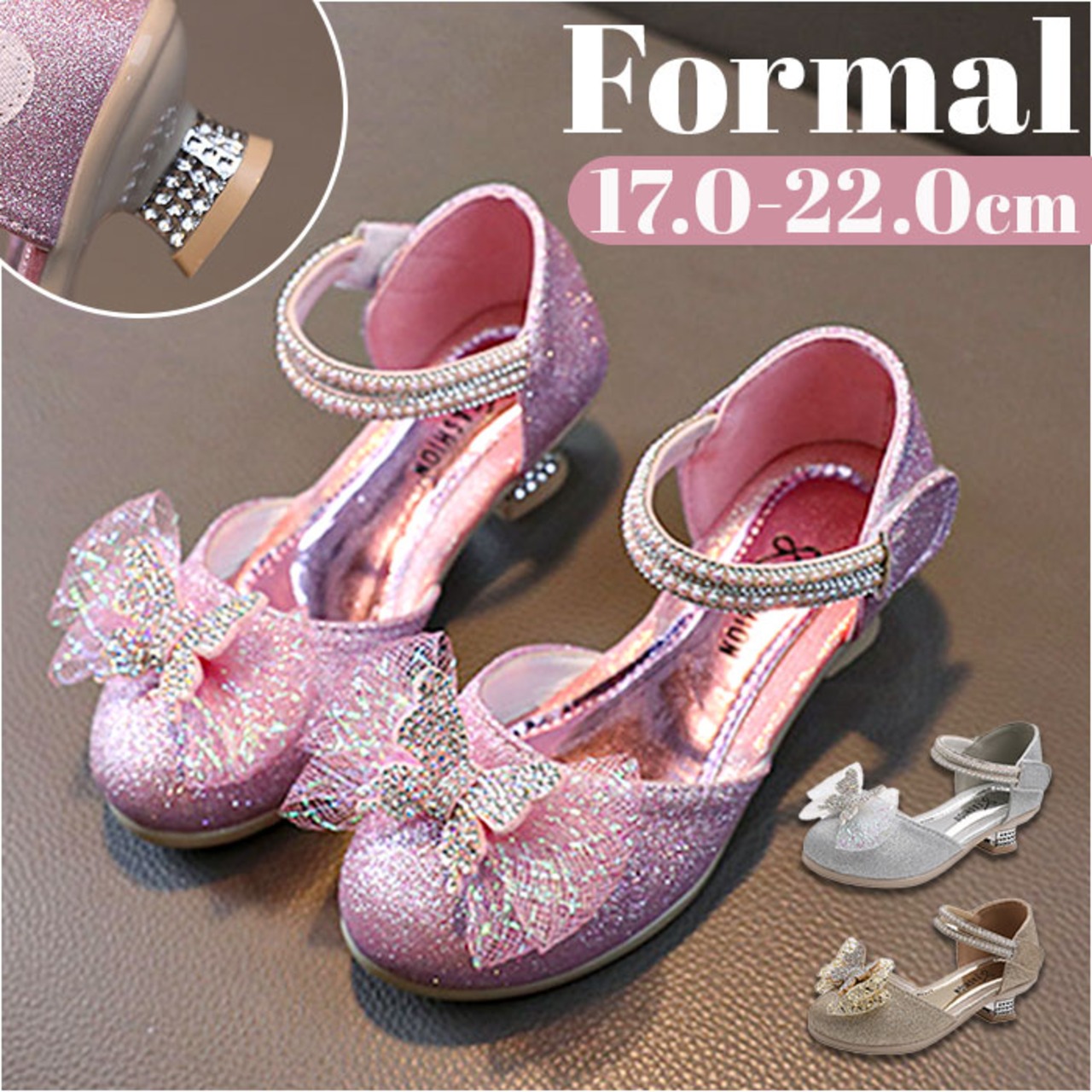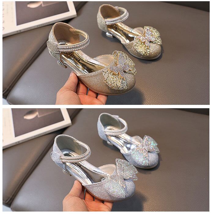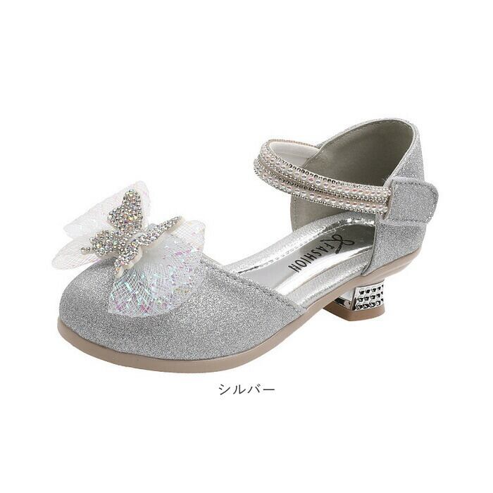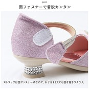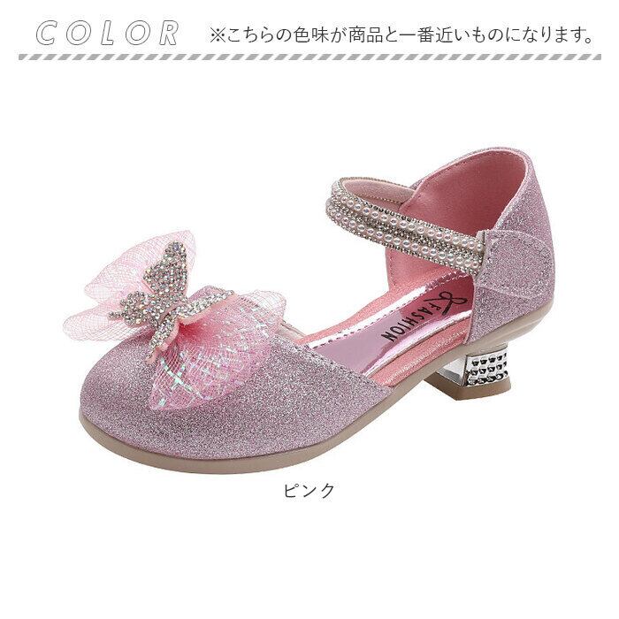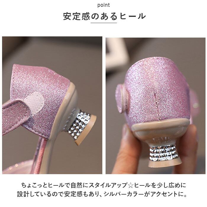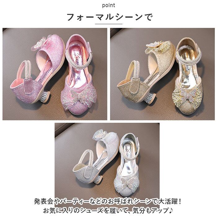 ・キラキラ輝いて、お姫様気分になれるグリッターシューズ☆つま先部分に立体的なリボン、ストラップ部分にもストーンなどをプラス。
