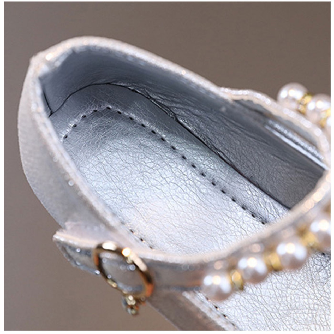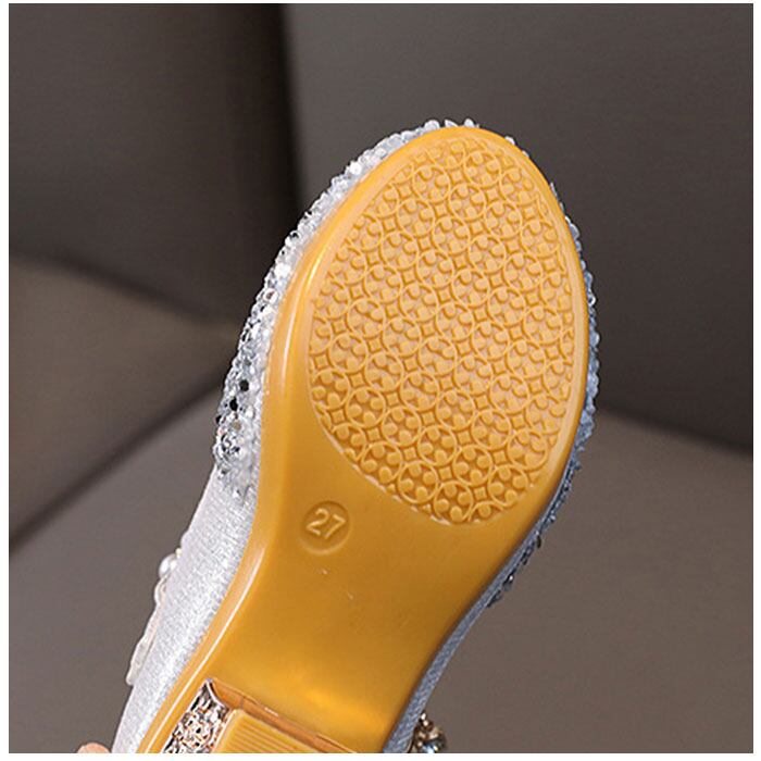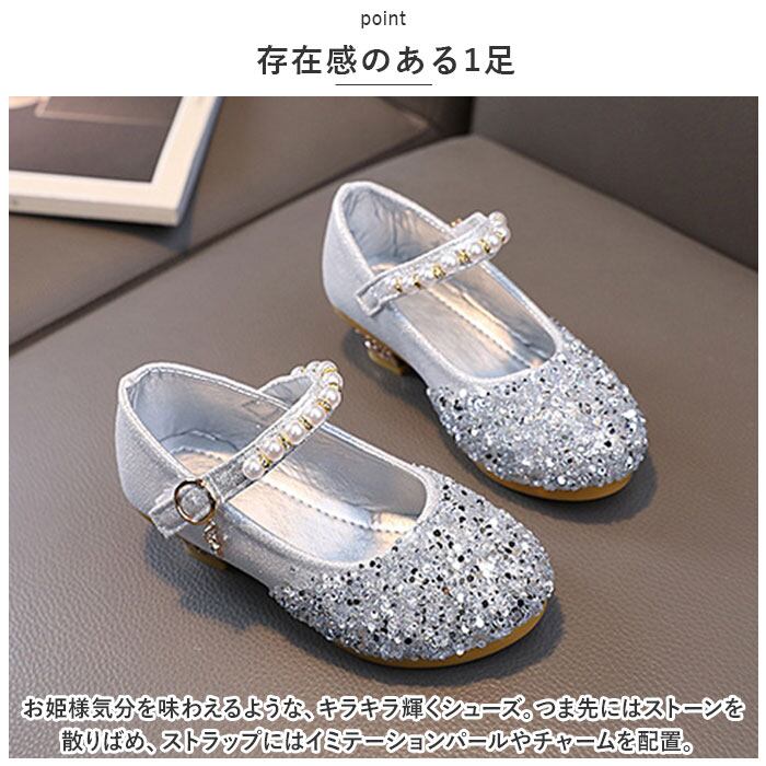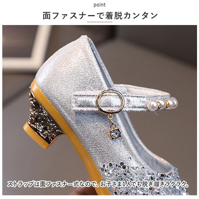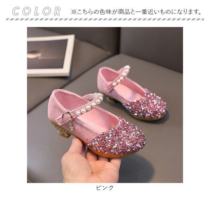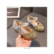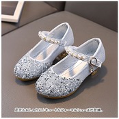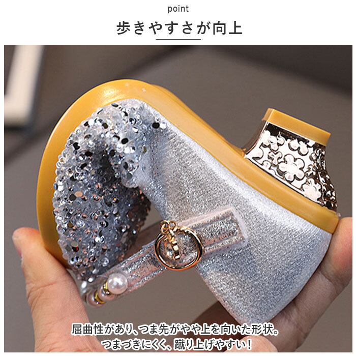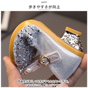 ・お姫様気分を味わえるような、キラキラ輝くシューズ。つま先にはストーンを散りばめ、ストラップにはイミテーションパールやチャームを配置。