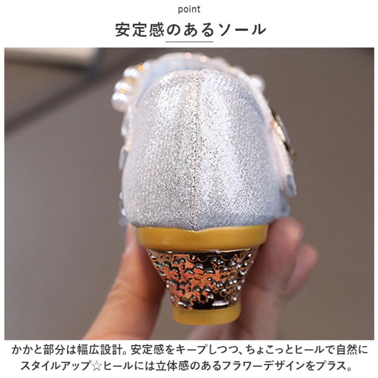 ・かかと部分は幅広設計。安定感をキープしつつ、ちょこっとヒールで自然にスタイルアップ☆ヒールには立体感のあるフラワーデザインをプラス。