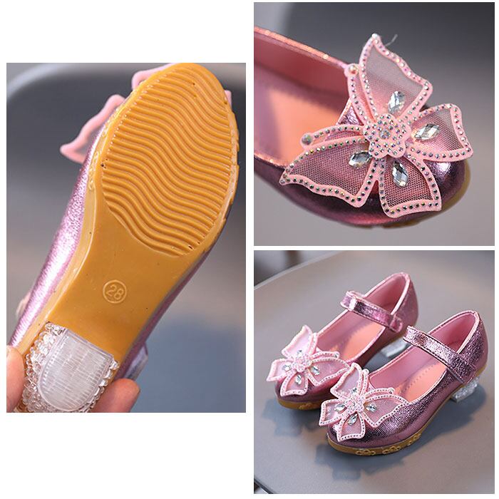 ・キラっと光沢があり、お姫様気分になれるシューズ☆つま先部分に配置された、立体的なモチーフには、ストーンなどをプラス。