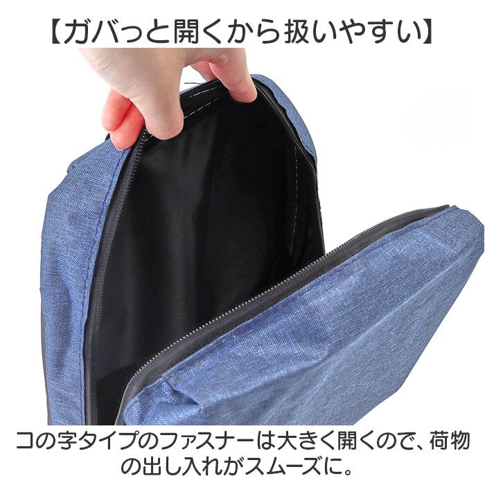 ・コの字タイプのファスナーは大きく開くので、荷物の出し入れがスムーズに。