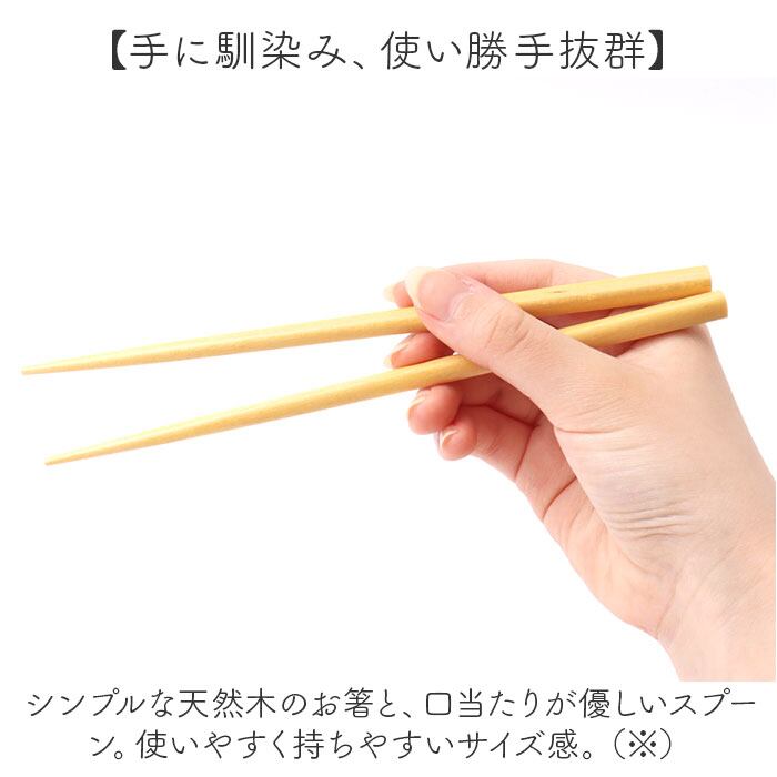 ・シンプルな天然木のお箸と、口当たりが優しいスプーン。使いやすく持ちやすいサイズ感。