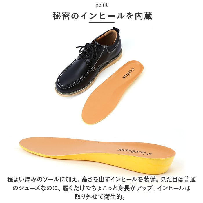 ・程よい厚みのソールに加え、高さを出すインヒールを装備。見た目は普通のシューズなのに、履くだけでちょこっと身長がアップ!インヒールは取り外せて衛生的。