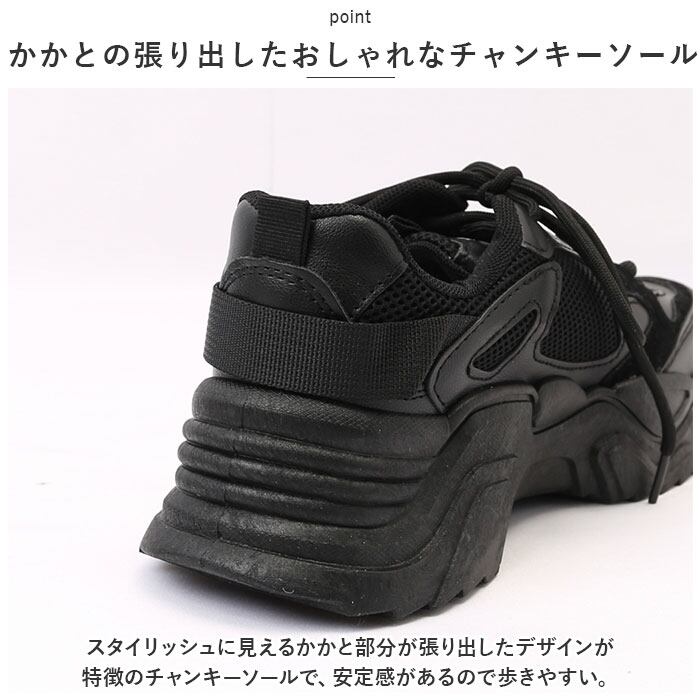 ・スタイリッシュに見えるかかと部分が張り出したデザインが特徴のチャンキーソールで、安定感があるので歩きやすい。