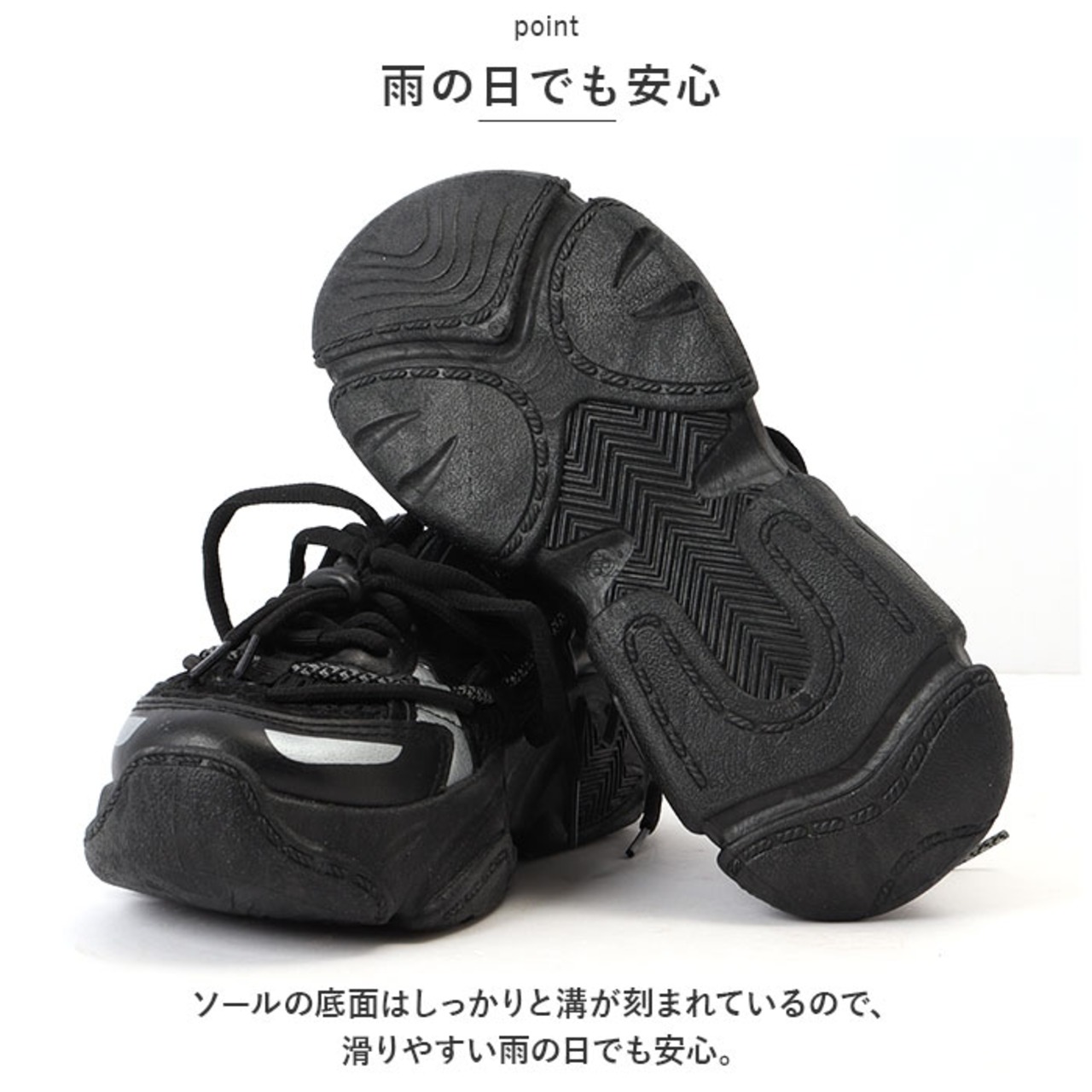 ・ソールの底面はしっかりと溝が刻まれているので、滑りやすい雨の日でも安心。