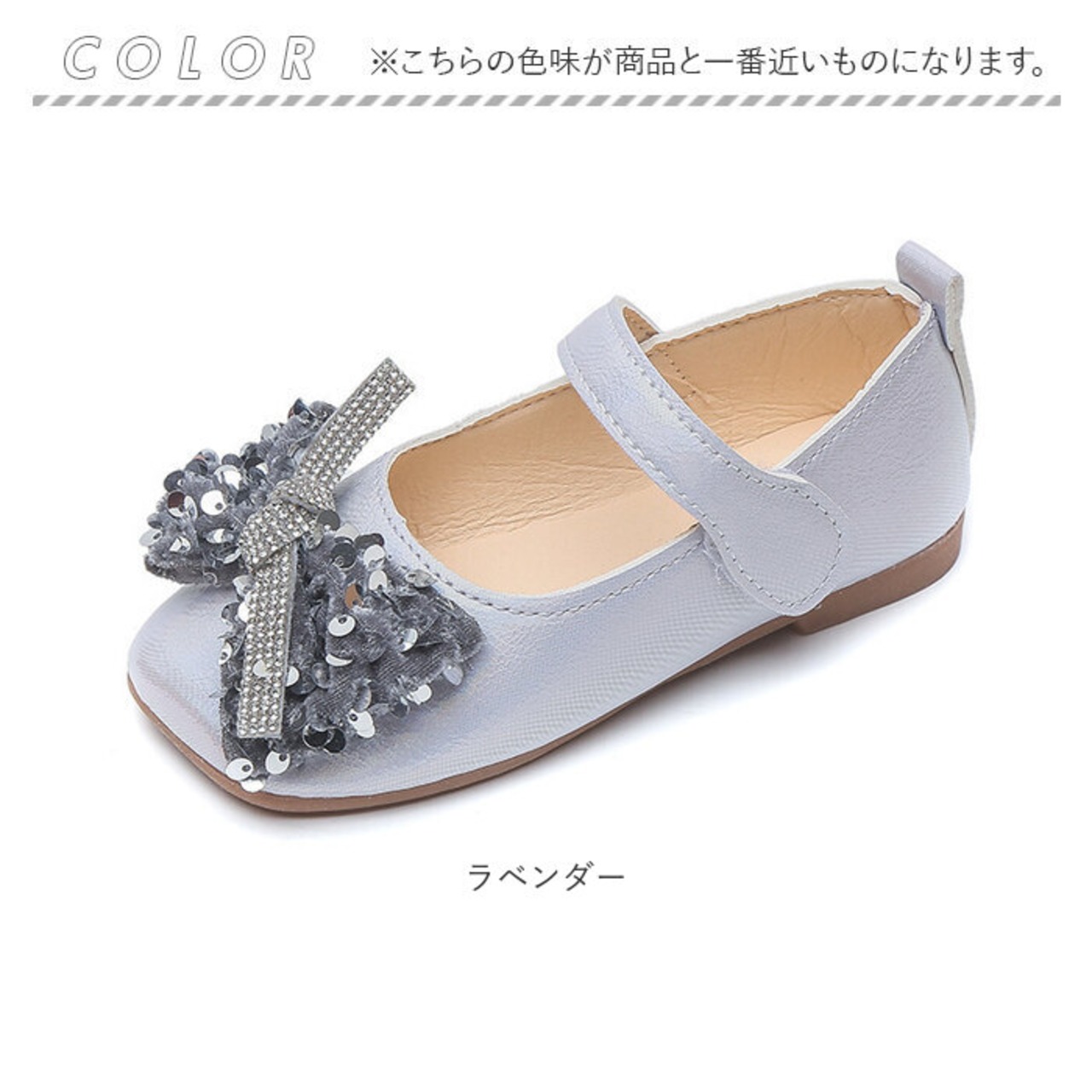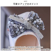 ・上品な光沢のある仕上がり。つま先部分に配置された立体的なリボンが印象的で、キラッと光るストーンやスパンコールもプラス。
