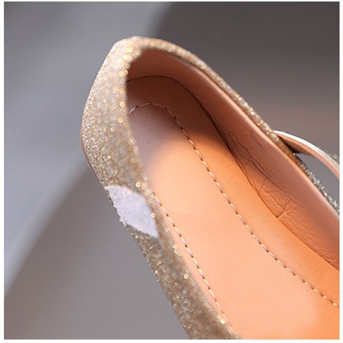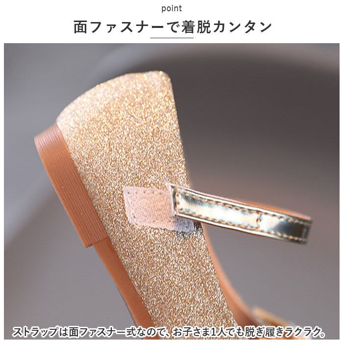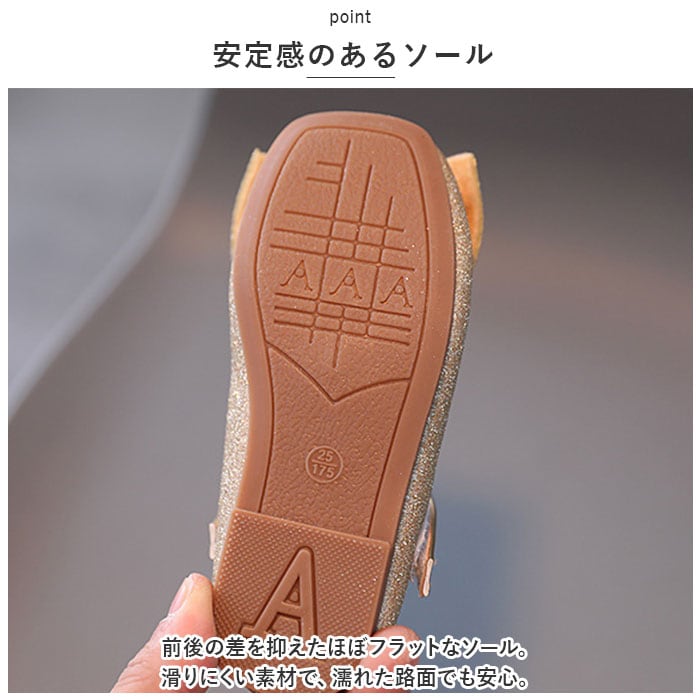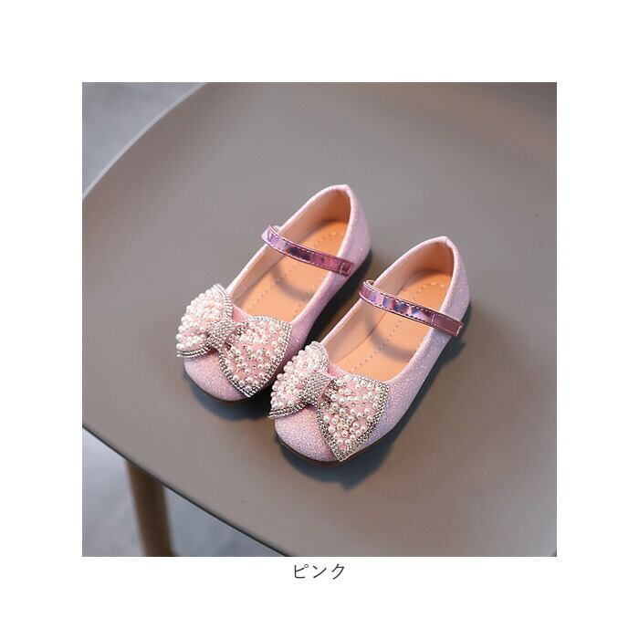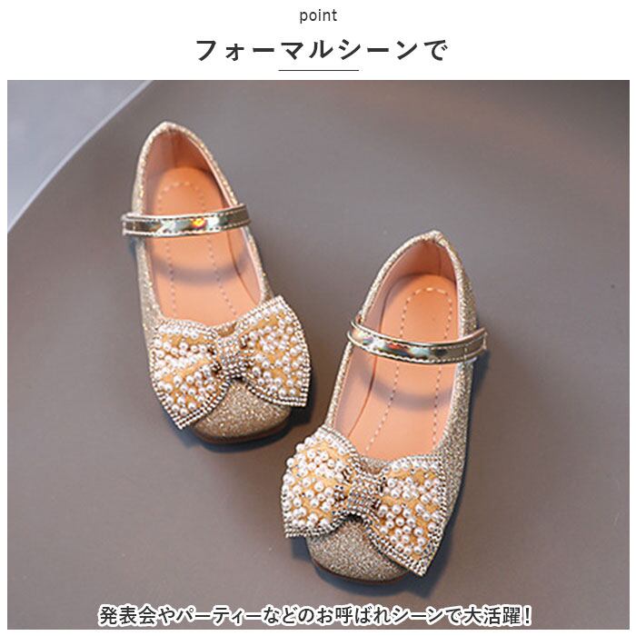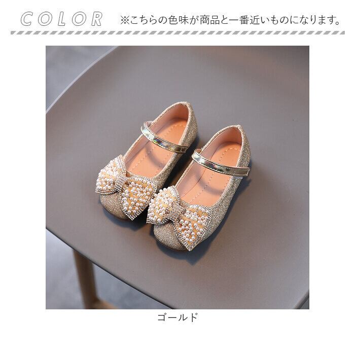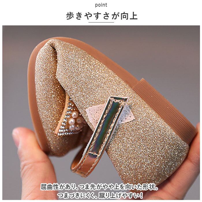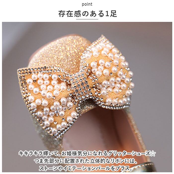 ・キキラキラ輝いて、お姫様気分になれるグリッターシューズ☆つま先部分に配置された立体的なリボンには、ストーンやイミテーションパールをプラス。
