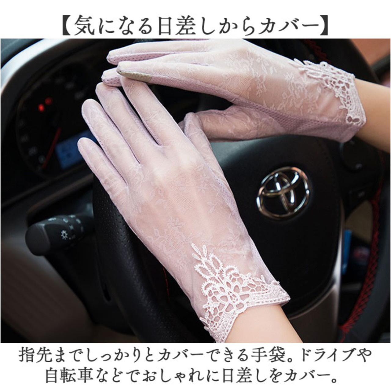 ・指先までしっかりとカバーできる手袋。ドライブや自転車などでおしゃれに日差しをカバー。