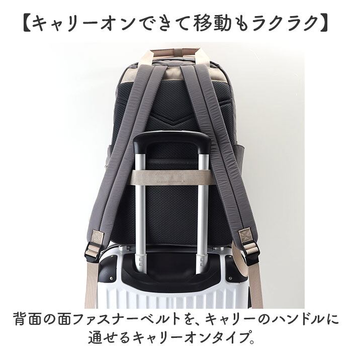 ・背面の面ファスナーベルトを、キャリーのハンドルに通せるキャリーオンタイプ。
