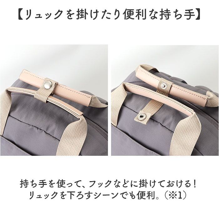 ・持ち手を使って、フックなどに掛けておける!リュックを下ろすシーンでも便利。