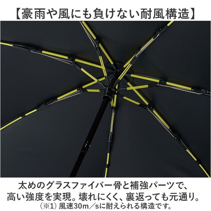 ・太めのグラスファイバー骨と補強パーツで、高い強度を実現。壊れにくく、裏返っても元通り。