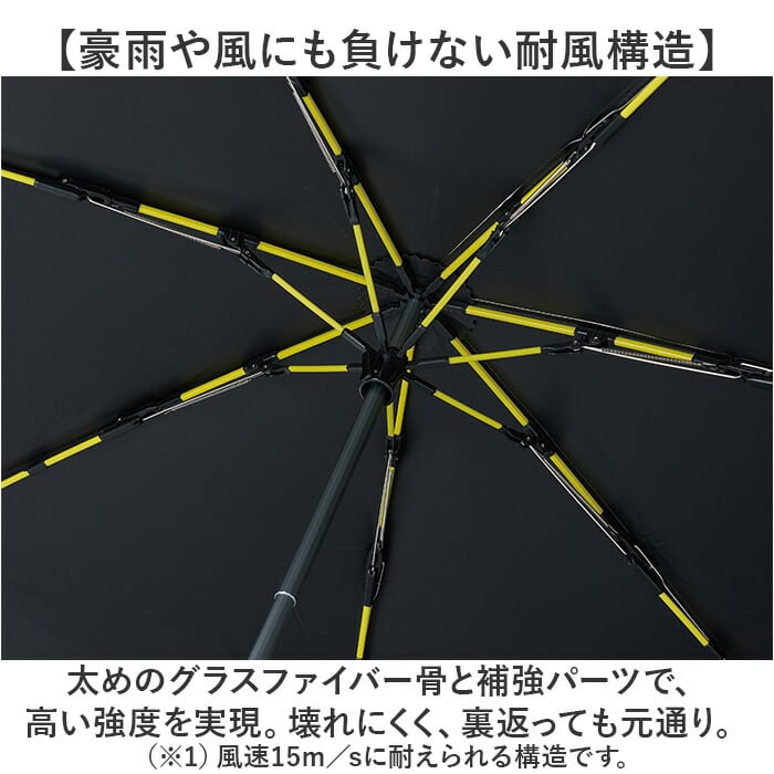・太めのグラスファイバー骨と補強パーツで、高い強度を実現。壊れにくく、裏返っても元通り。