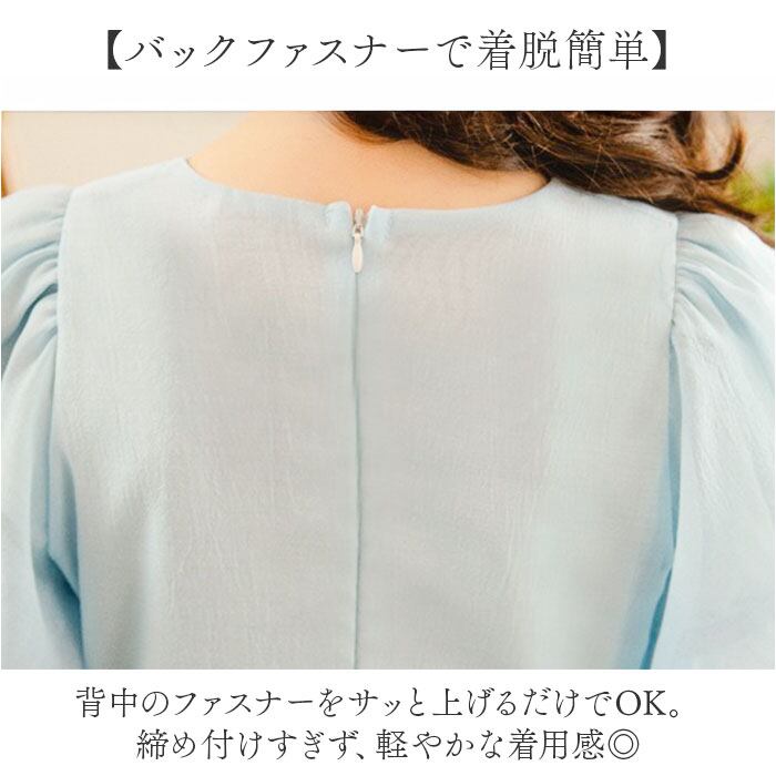 ・背中のファスナーをサッと上げるだけでOK。締め付けすぎず、軽やかな着用感◎