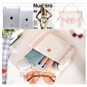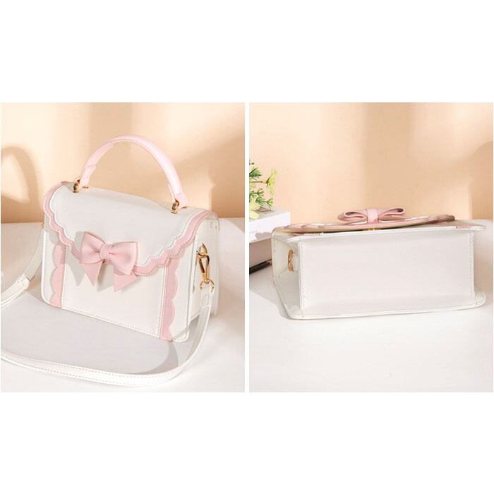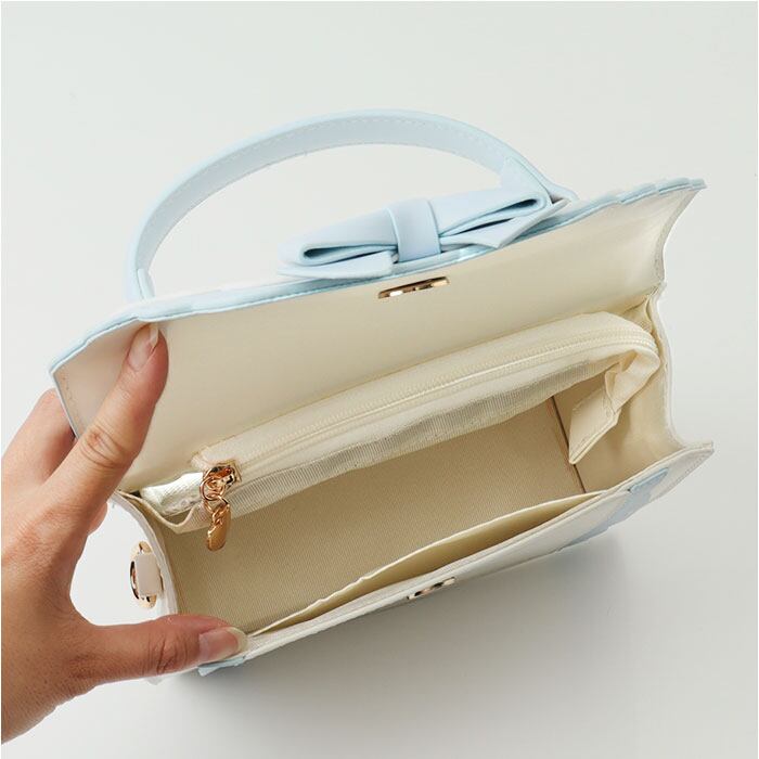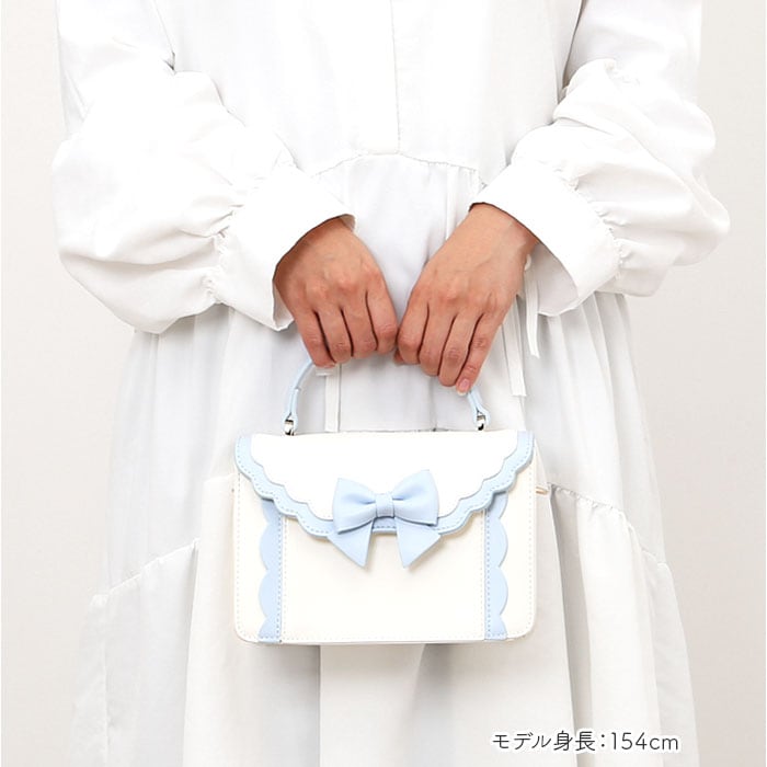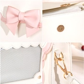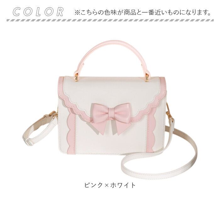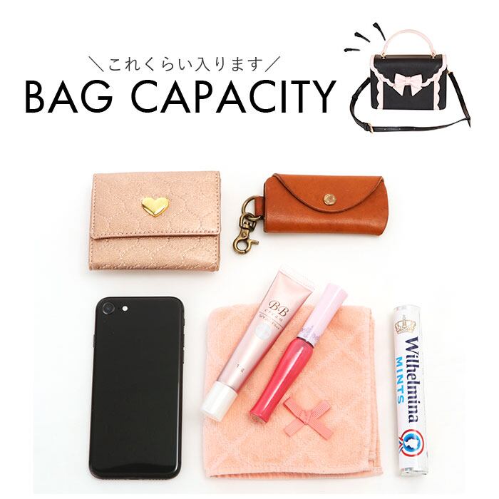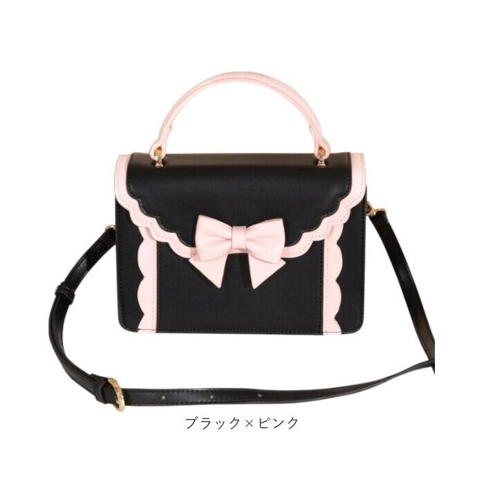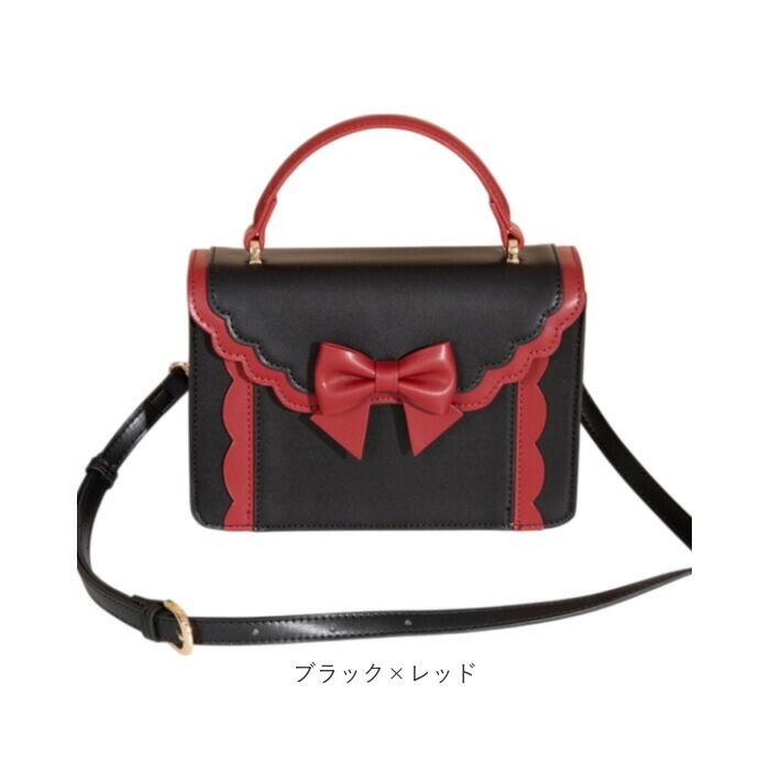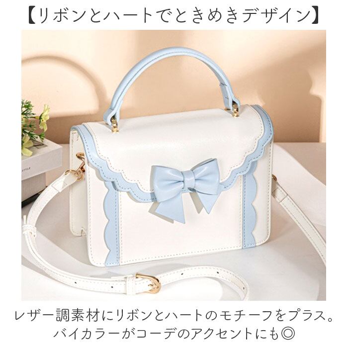 ・レザー調素材にリボンとハートのモチーフをプラス。バイカラーがコーデのアクセントにも◎