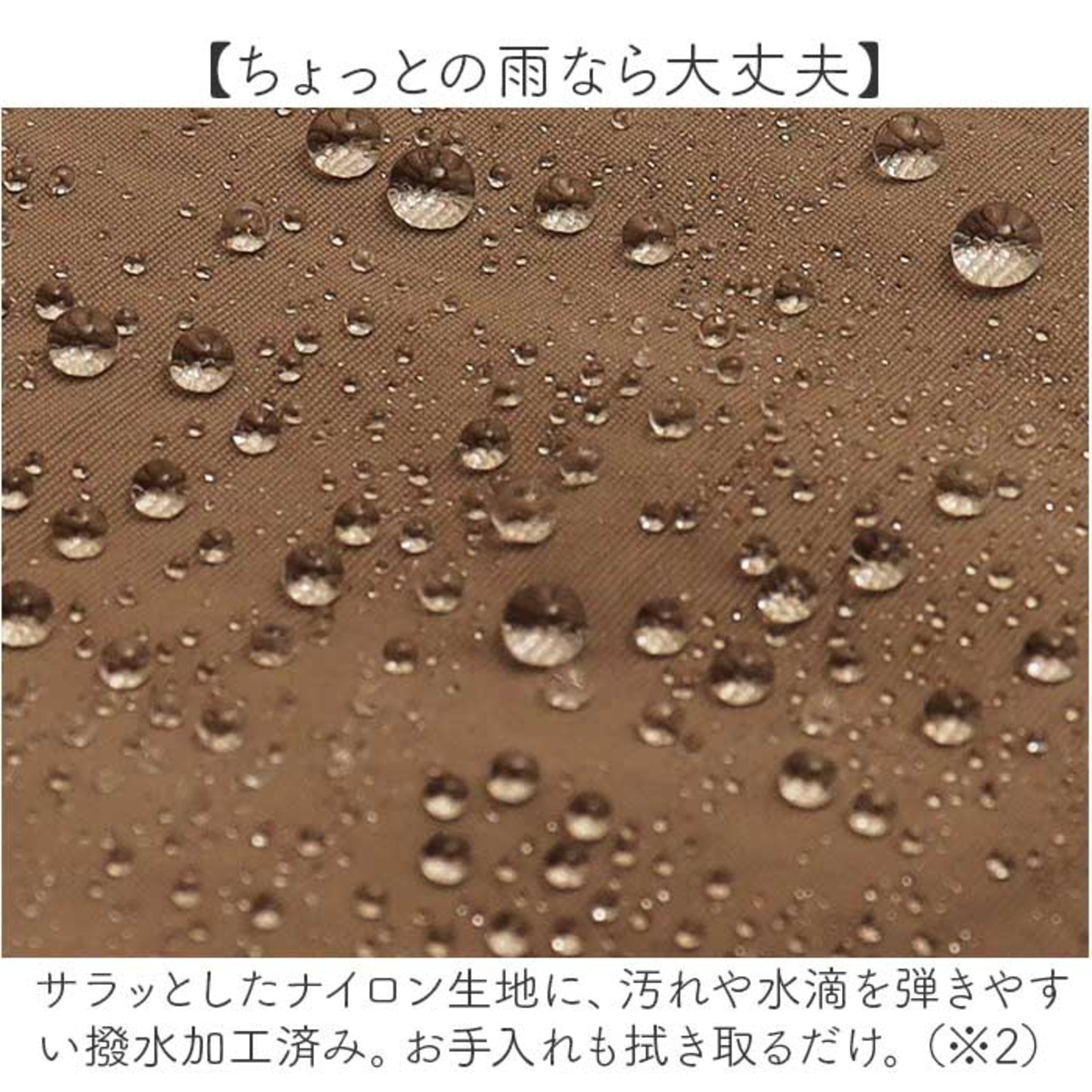 ・サラッとしたナイロン生地に、汚れや水滴を弾きやすい撥水加工済み。お手入れも拭き取るだけ。