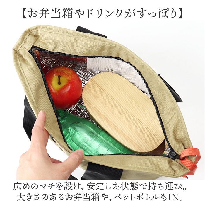 ・広めのマチを設け、安定した状態で持ち運び。大きさのあるお弁当箱や、ペットボトルもIN。