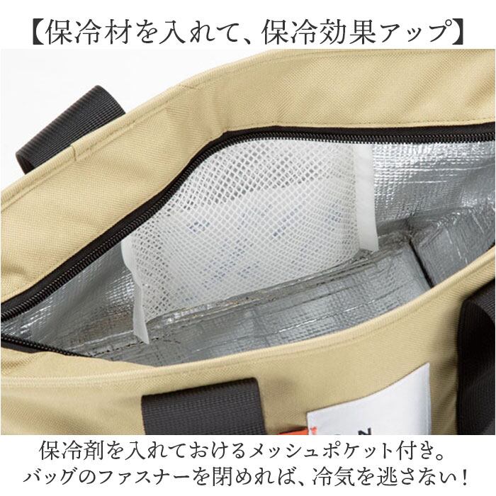 ・保冷剤を入れておけるメッシュポケット付き。バッグのファスナーを閉めれば、冷気を逃さない!