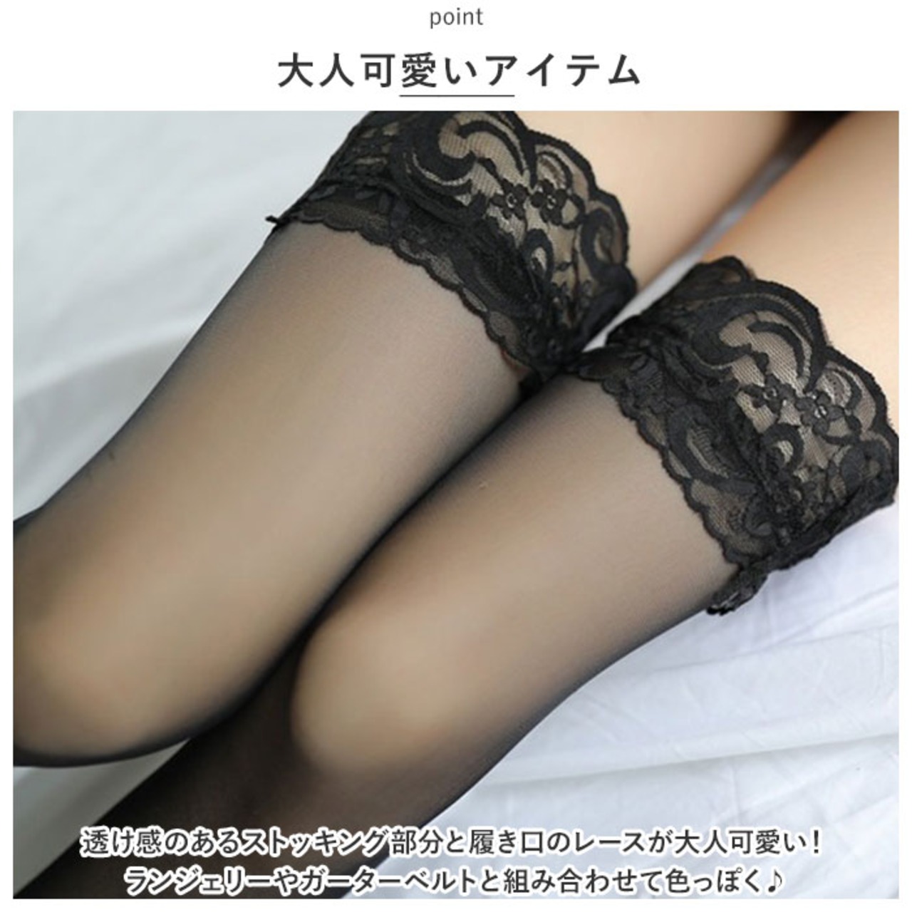 ・透け感のあるストッキング部分と履き口のレースが大人可愛い!ランジェリーやガーターベルトと組み合わせて色っぽく♪