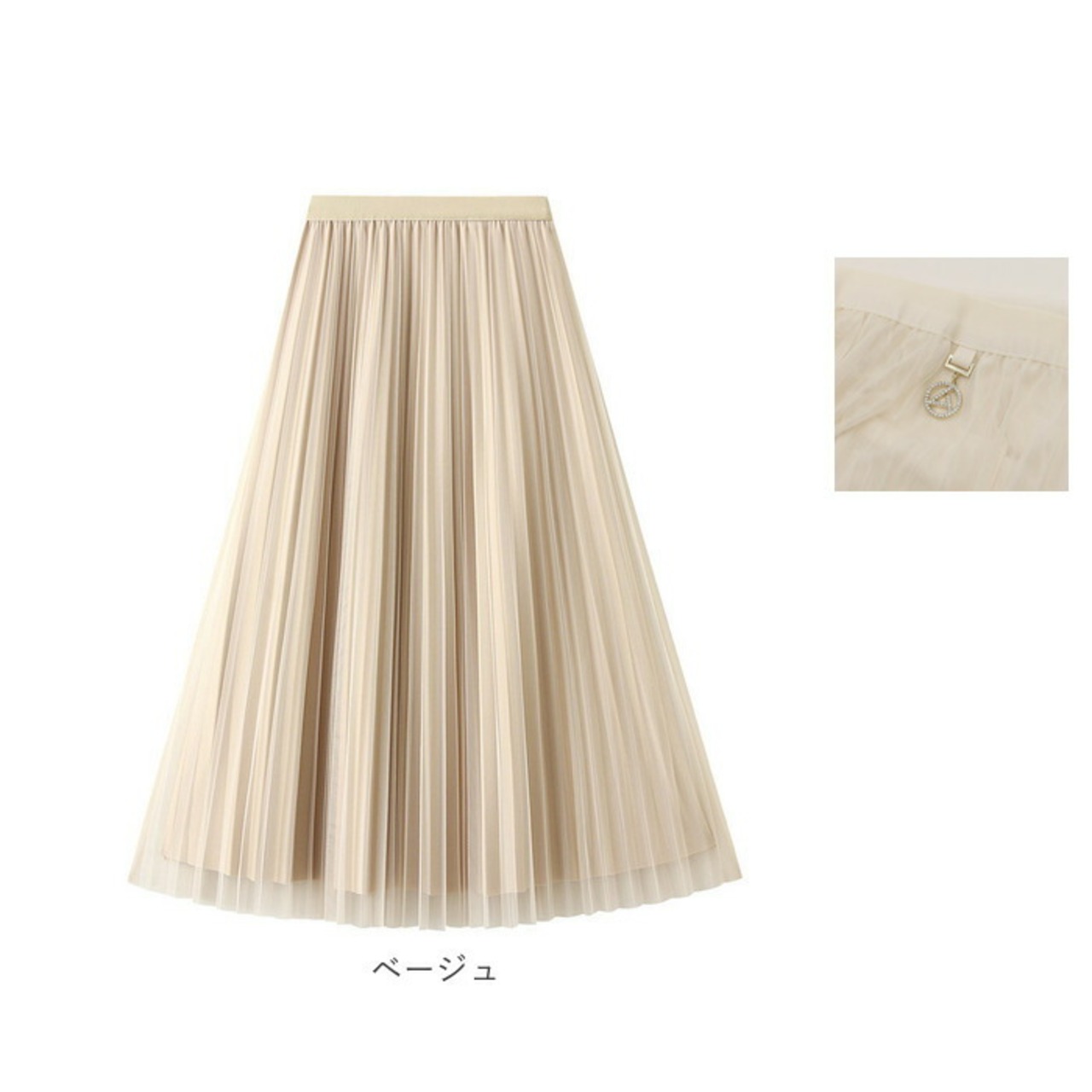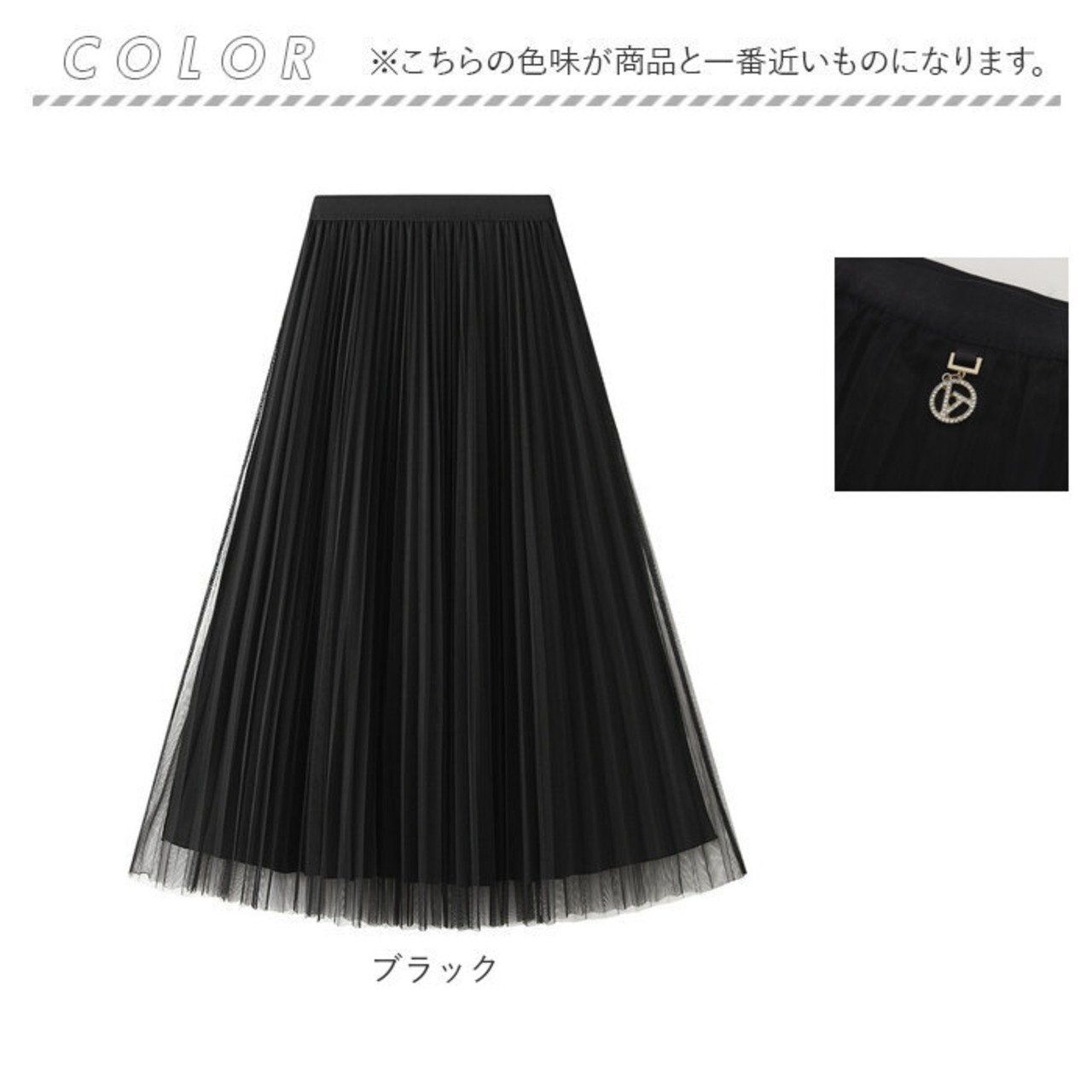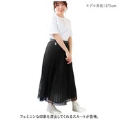 ・光沢のある生地にチュールを重ね、大人な雰囲気に仕上げたプリーツスカート。ウエスト部分のキラッと光るチャームがアクセントに。